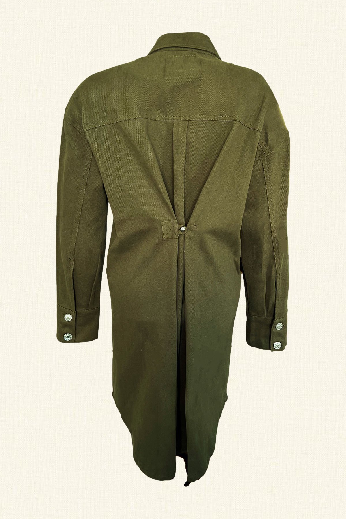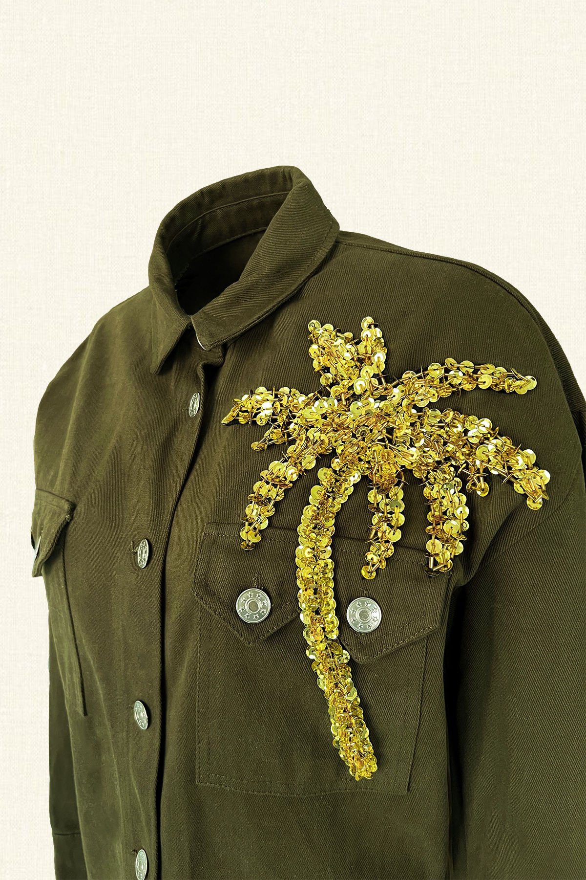 Ön kısmında pul ve boncuklardan işlenmiş palmiye bulunan, arka kısmında düğme detayı bulunan uzun yeşil renk jean ceket.