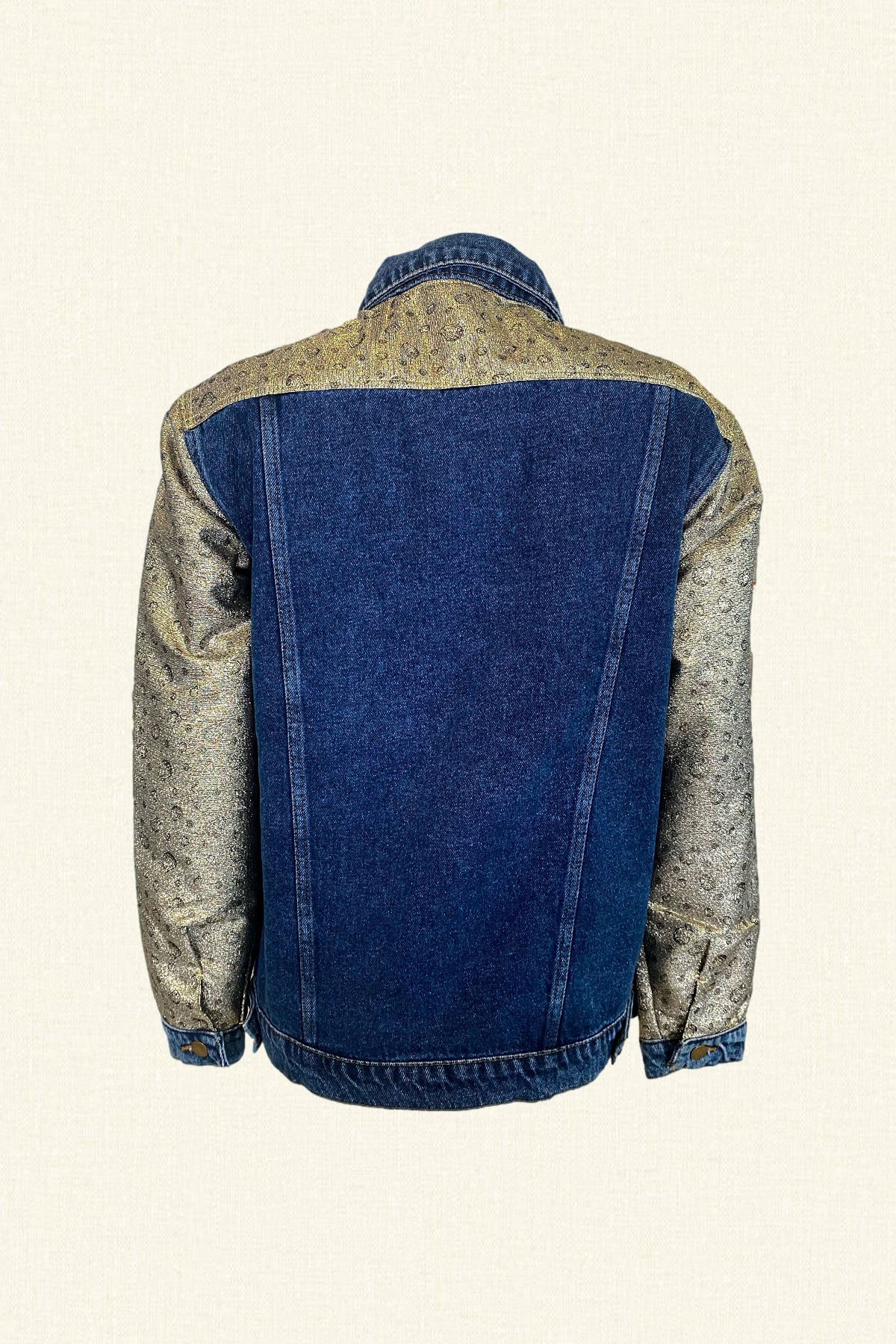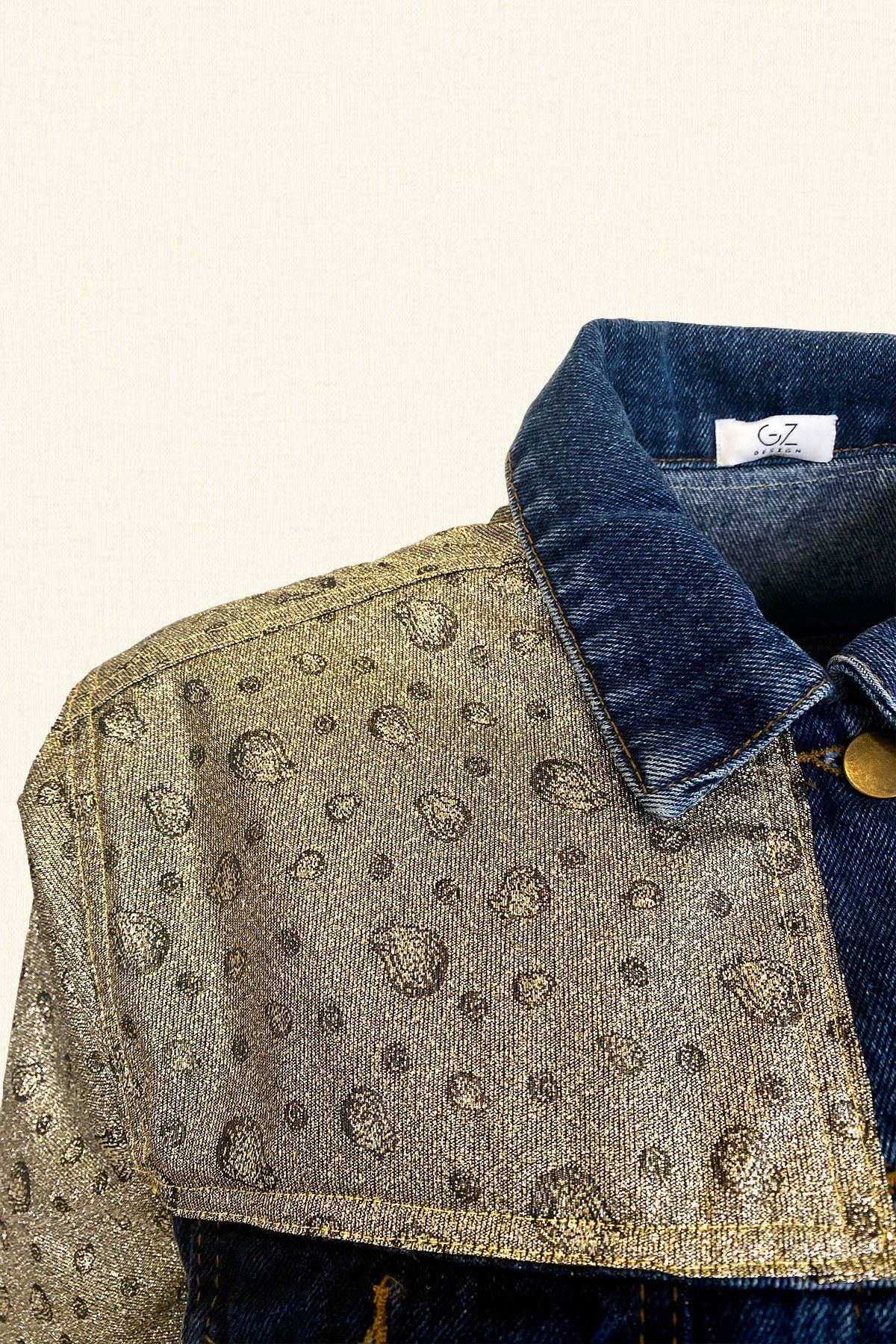 Kolları ve robası parlak gold kumaş detaylı koyu renk denim ceket.