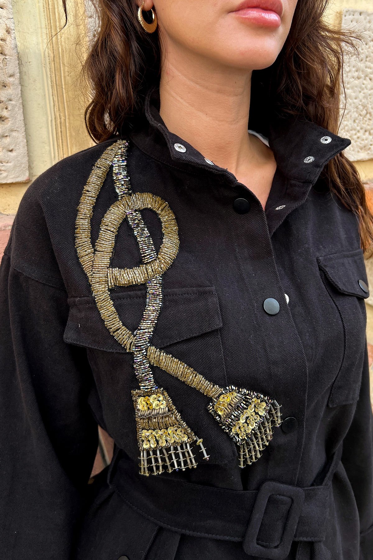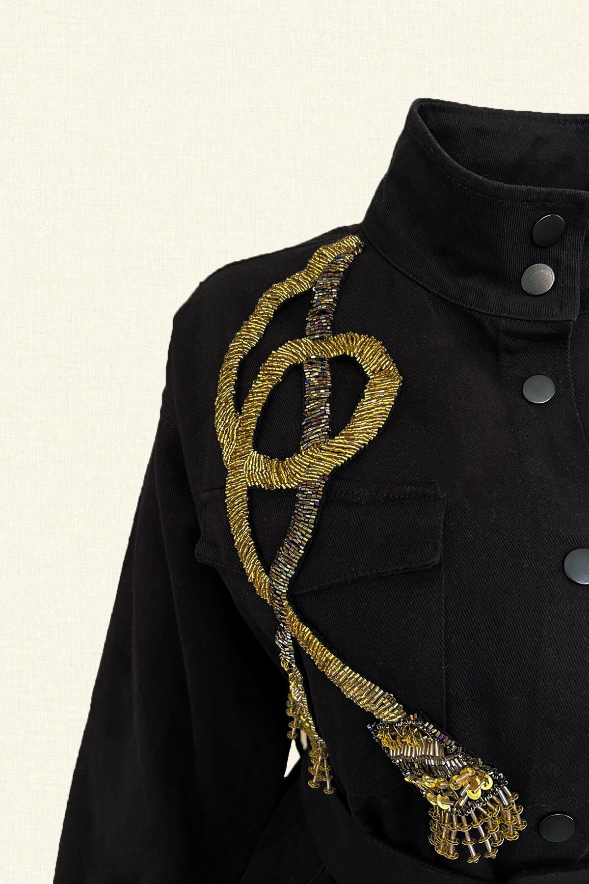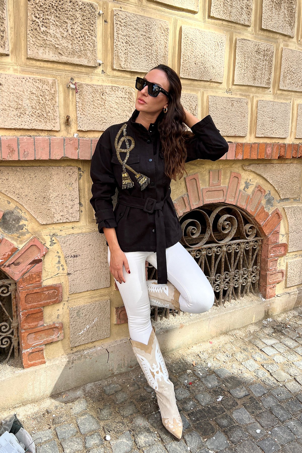 Yaka kısmında gold boncuk ve kristallerden püskül işlemesi bulunan, kemer detaylı siyah renk ceket.