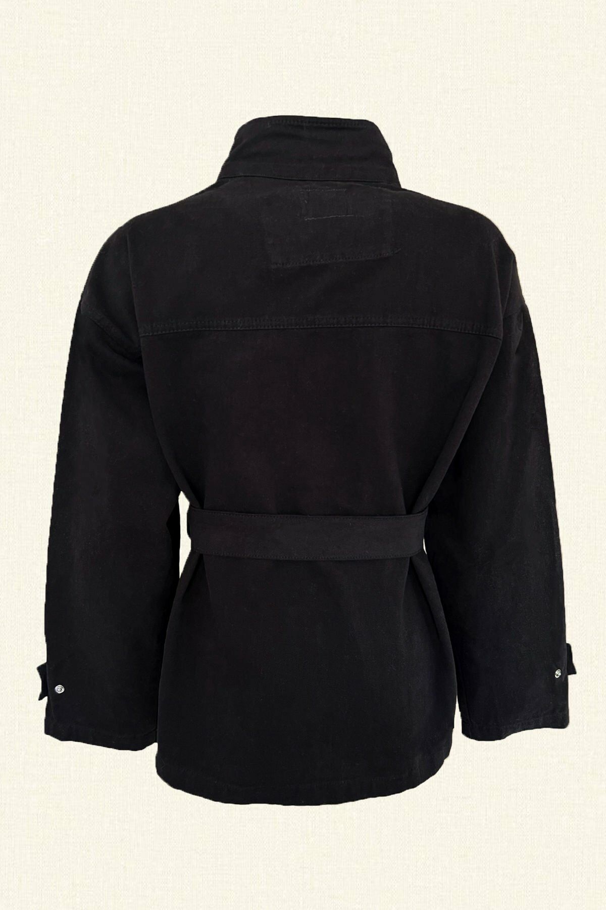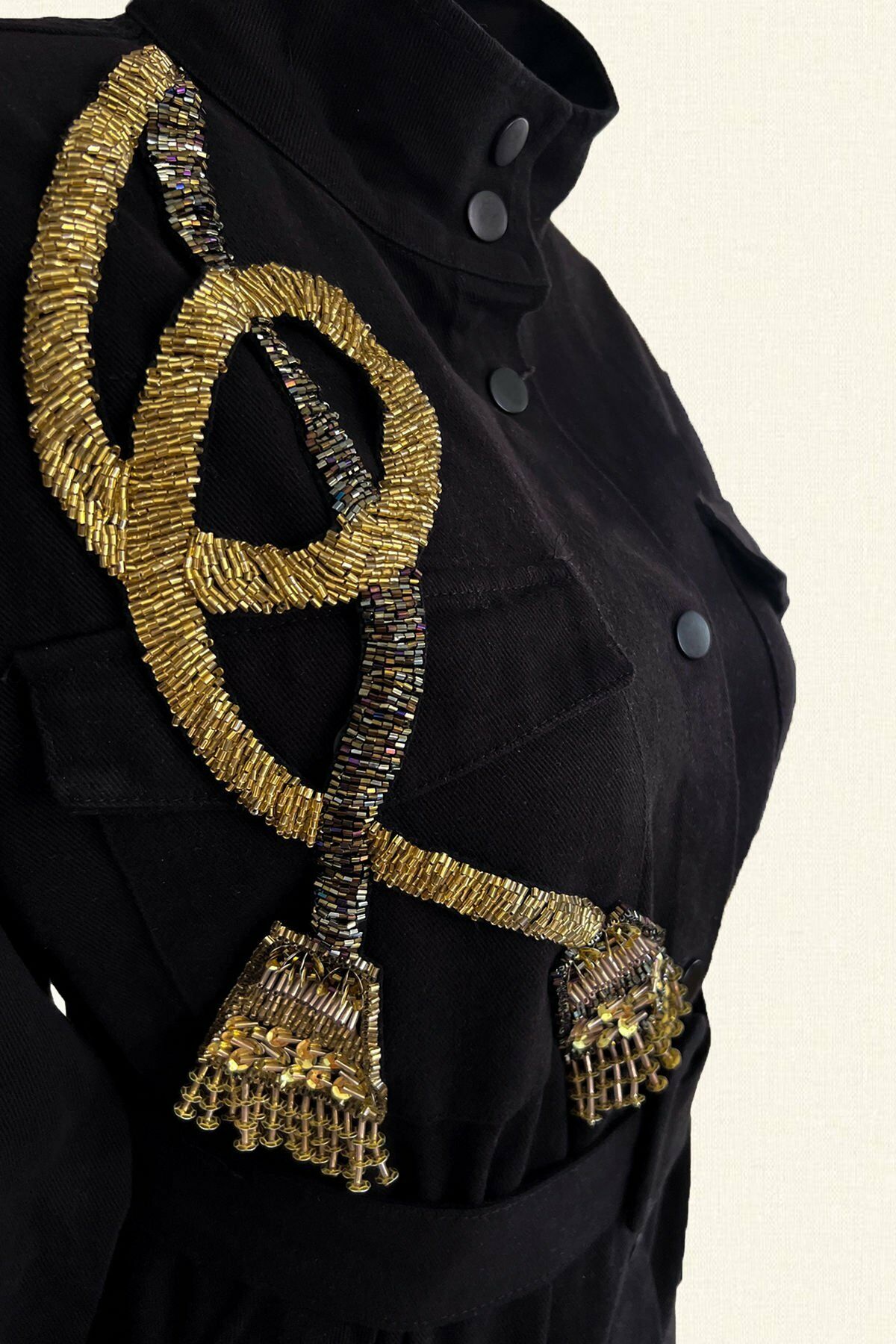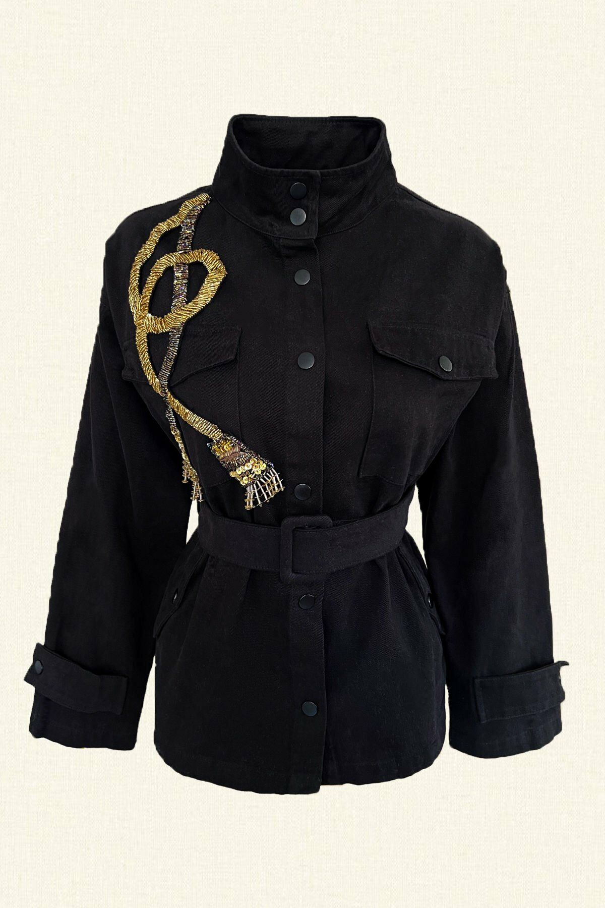 Yaka kısmında gold boncuk ve kristallerden püskül işlemesi bulunan, kemer detaylı siyah renk ceket.