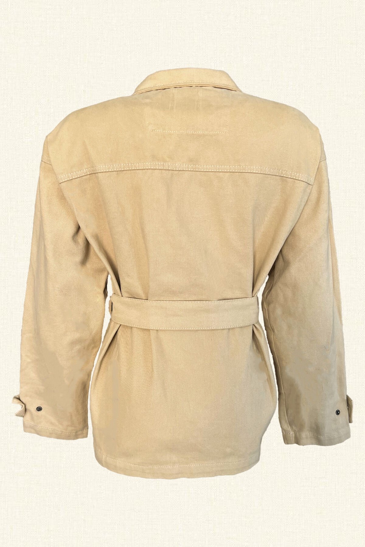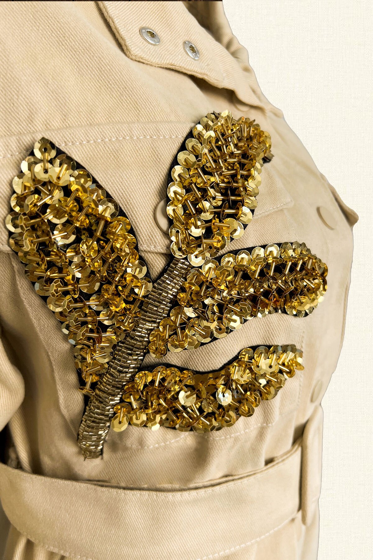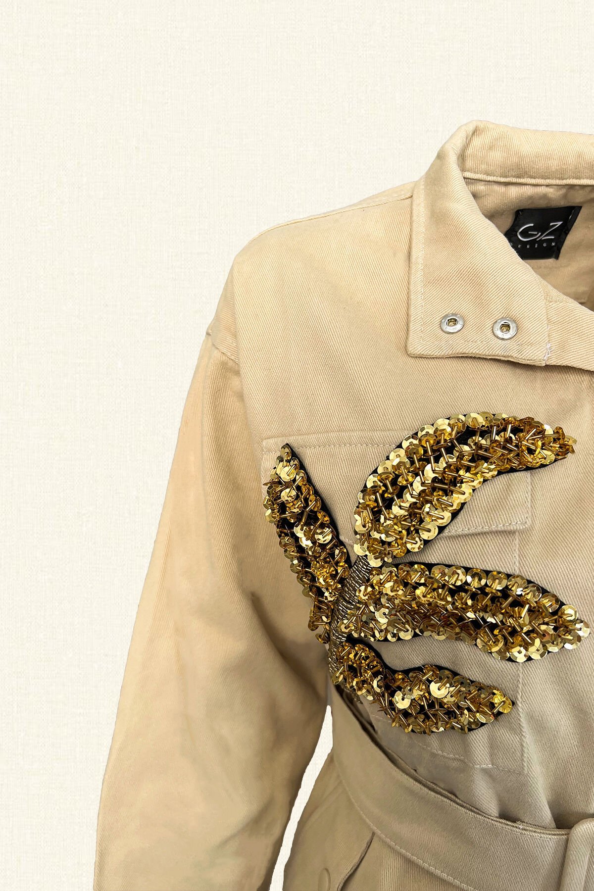 Ön kısmında gold boncuk ve pullardan yaprak işlemesi bulunan, krem renk, kemer detaylı jean ceket.