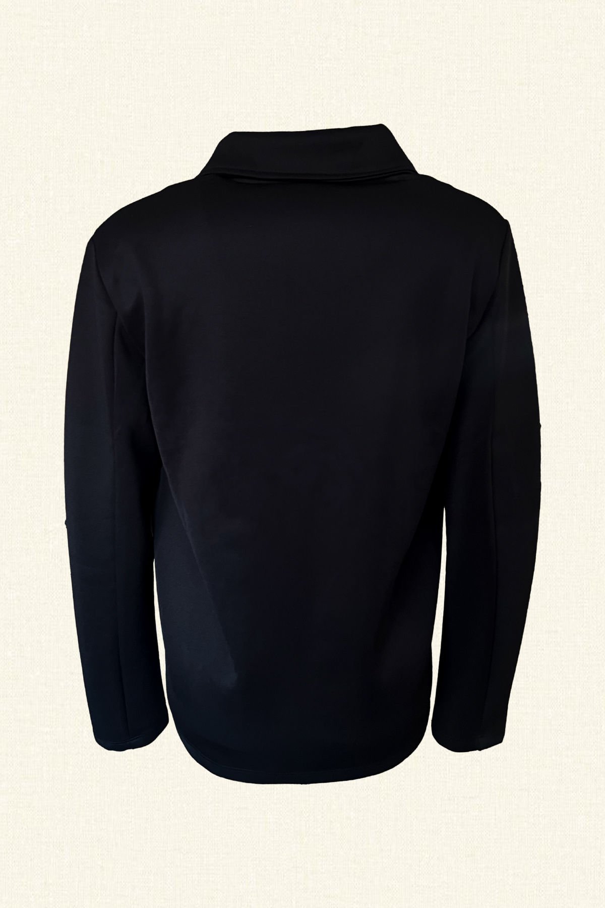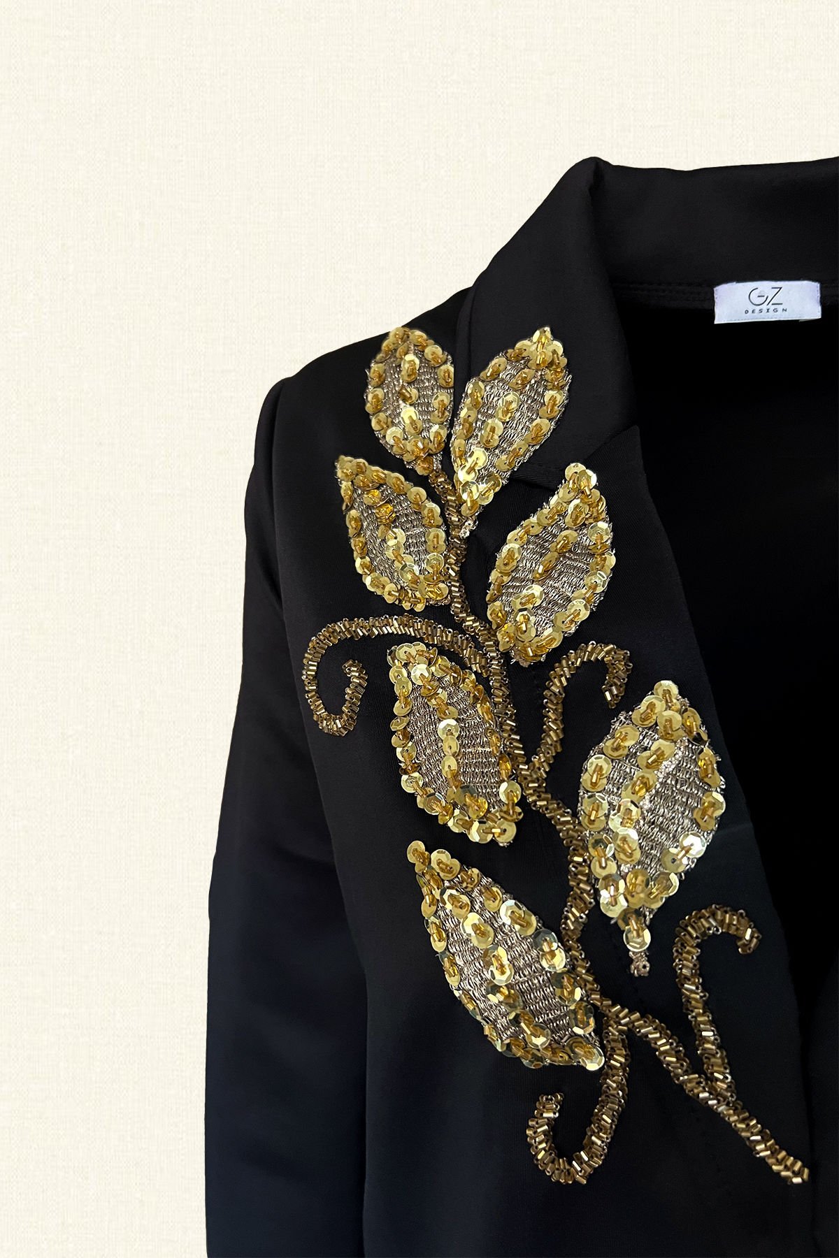 Ön kısmında gold yaprak figürü üzeri boncuk işlemeli, çıt çıt kapamalı, çıt çıtlarında gold iplikten işlemesi bulunan, siyah blazer ceket.