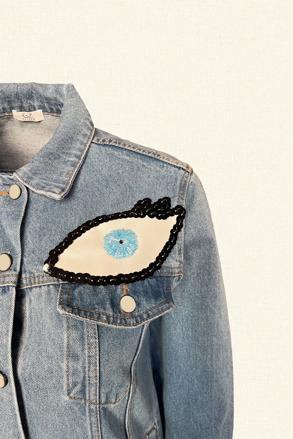 Ön ve arka kısmında deri üzerine boncuklardan göz işlemesi bulunan, açık renk jean ceket.