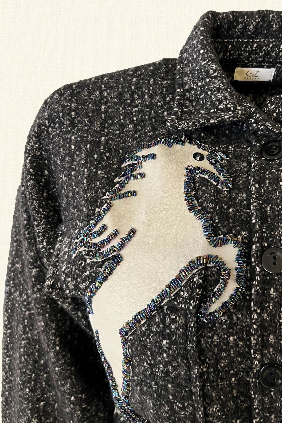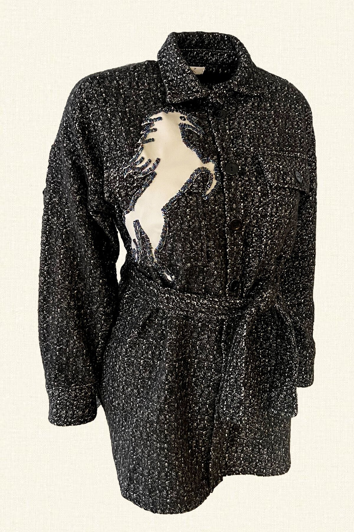 Gri Deri At Figürlü Boncuk İşlemeli Beli Kemerli Siyah Yünlü Kaşe Ceket
