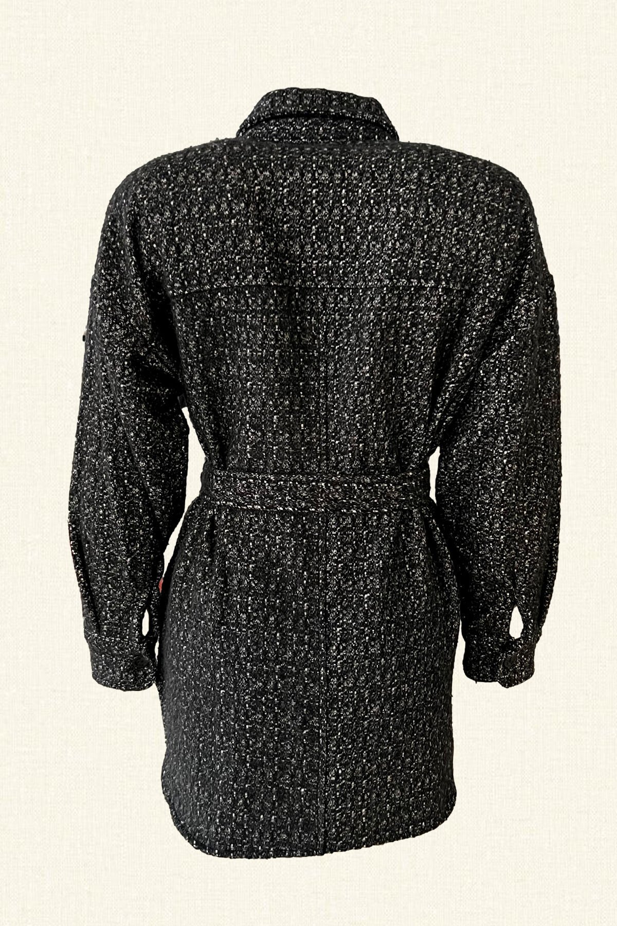 Ön kısmında gri deri üzerine boncuk işlemesi bulunan, kemer detaylı, yünlü siyah kırçıllı oversize ceket.
