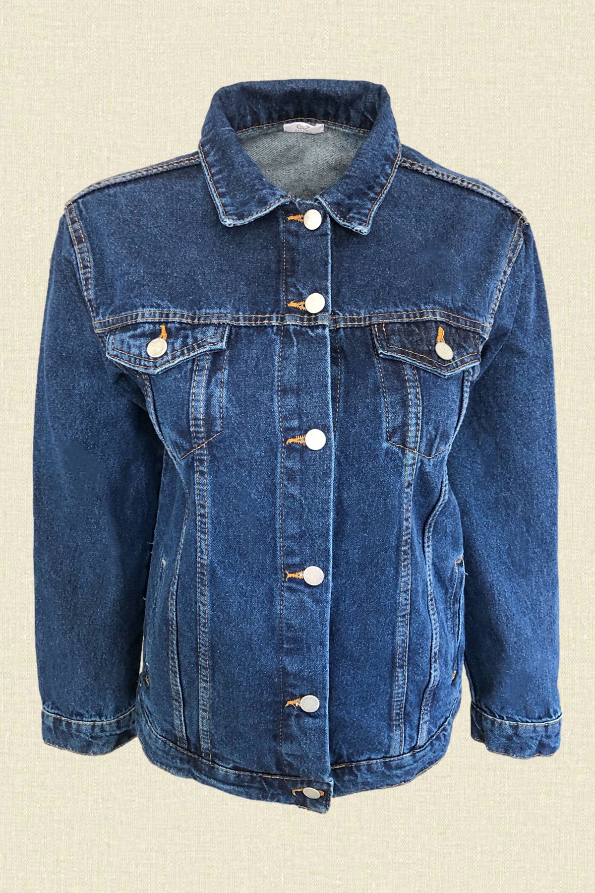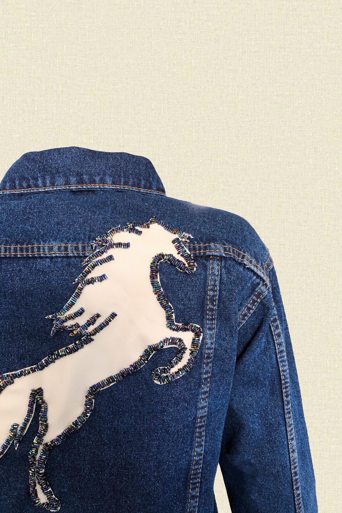Ön kısmında gri deri üzerine boncuklardan at işlemesi bulunan koyu renk jean ceket.