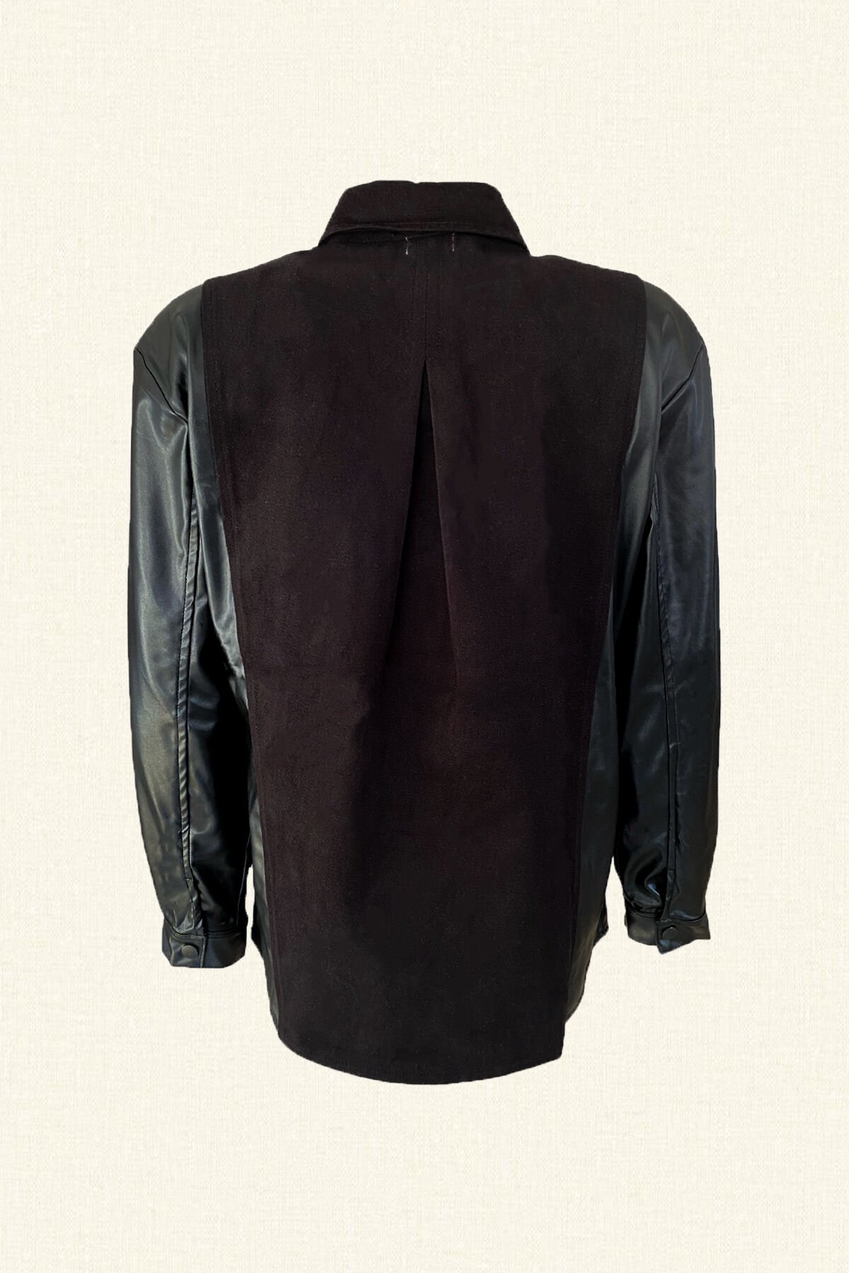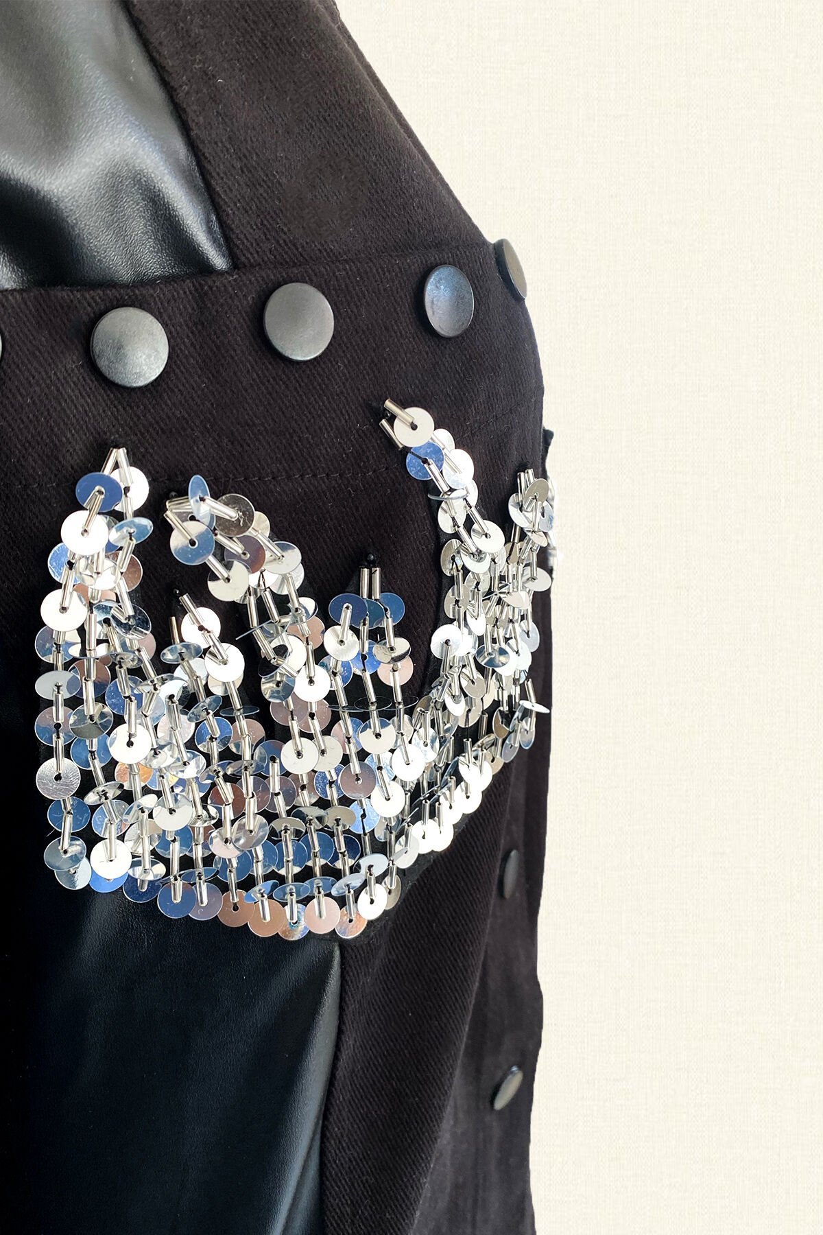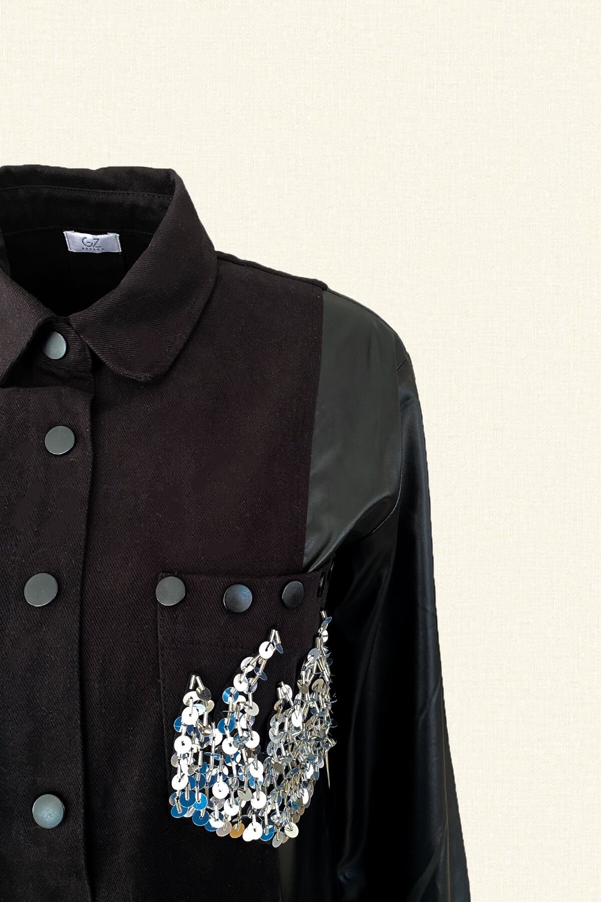 Cep kısımlarında gümüş pul ve boncuklardan alev işlemesi bulunan, kolları deri detaylı siyah jean ceket.