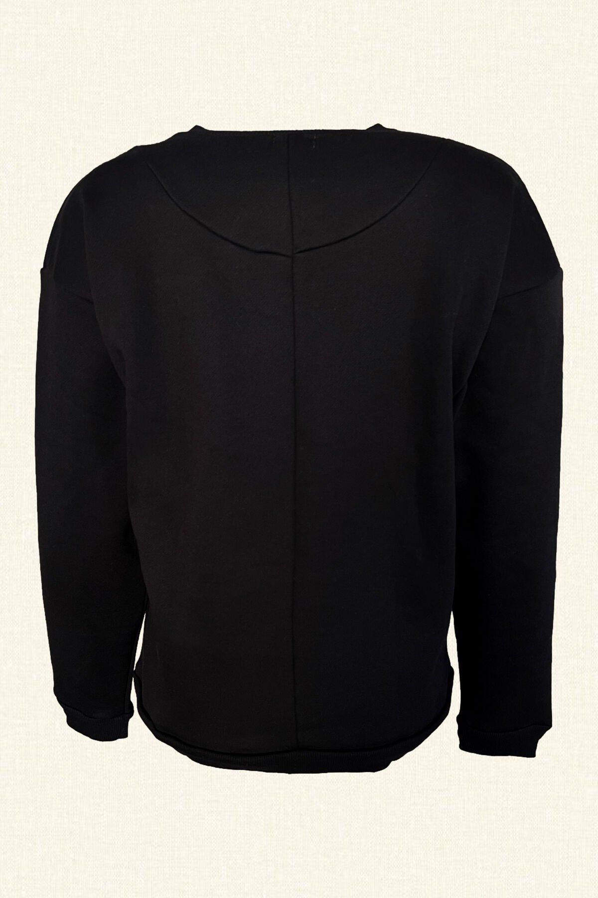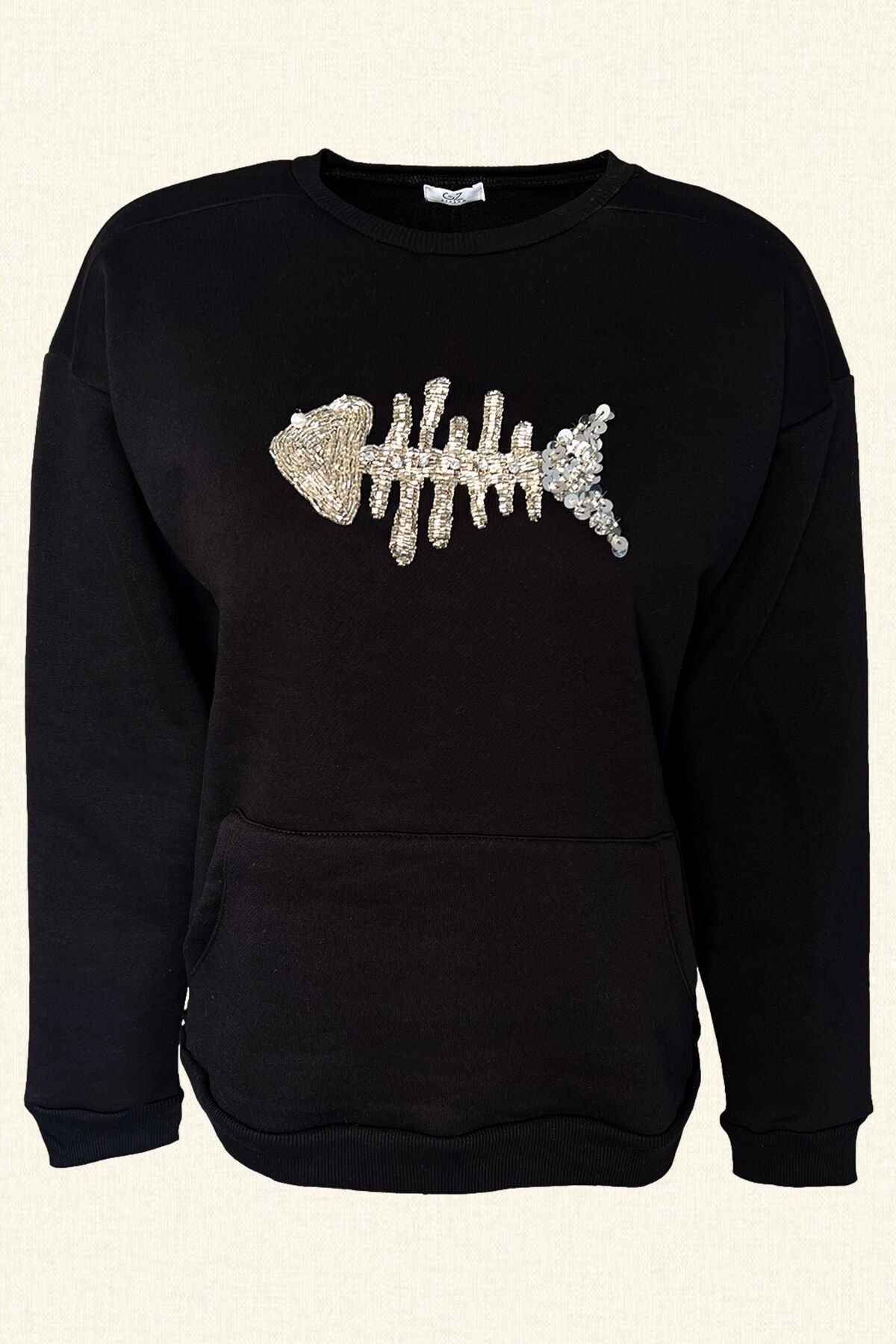 Ön kısmında gümüş pul ve boncuklardan balık işlemesi bulunan,kanguru cep detaylı siyah sweatshirt.
