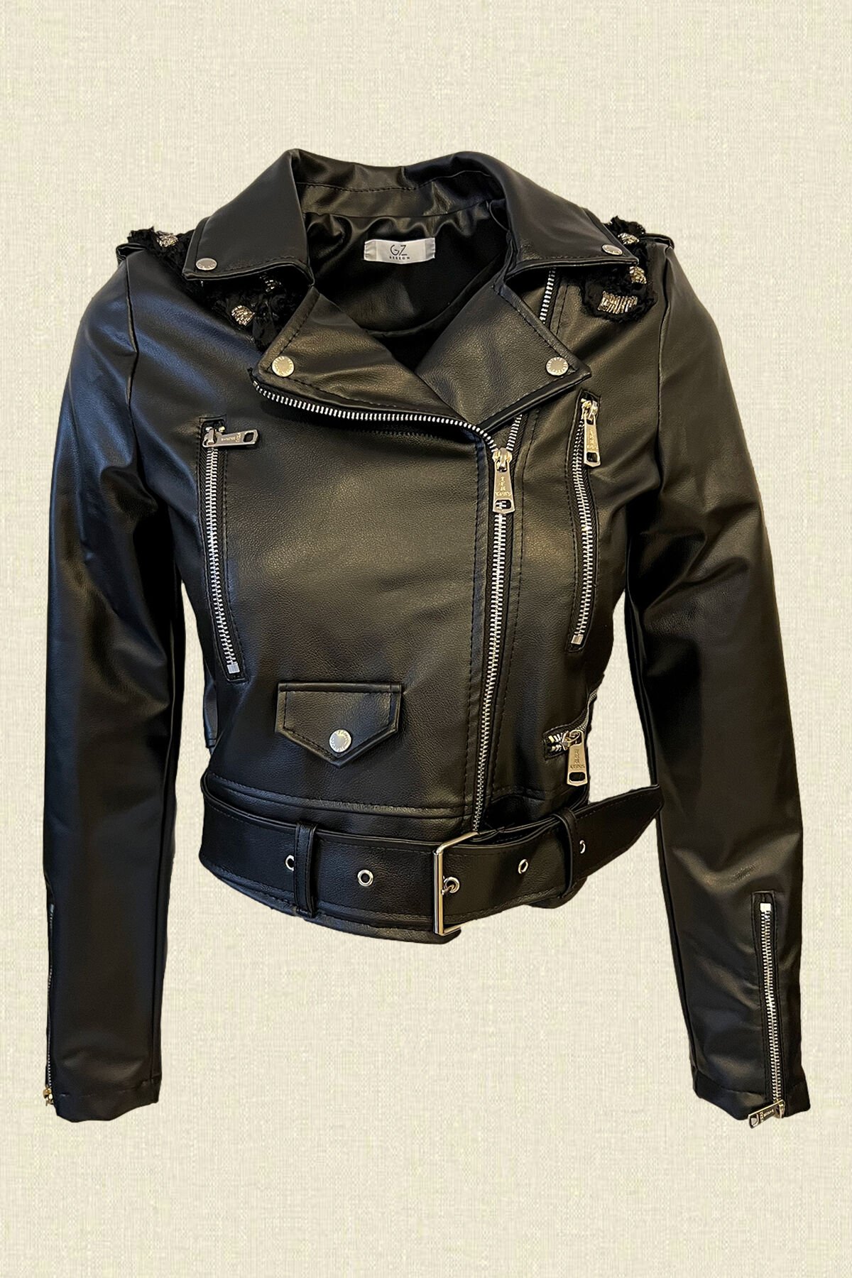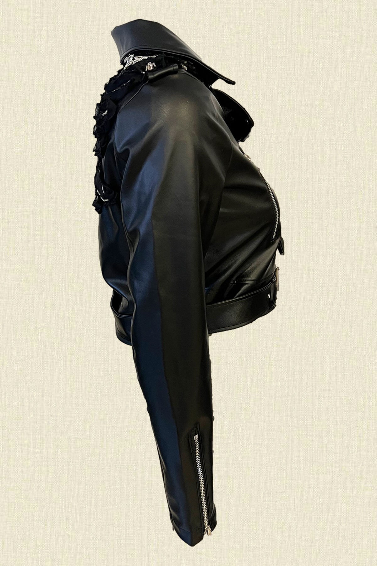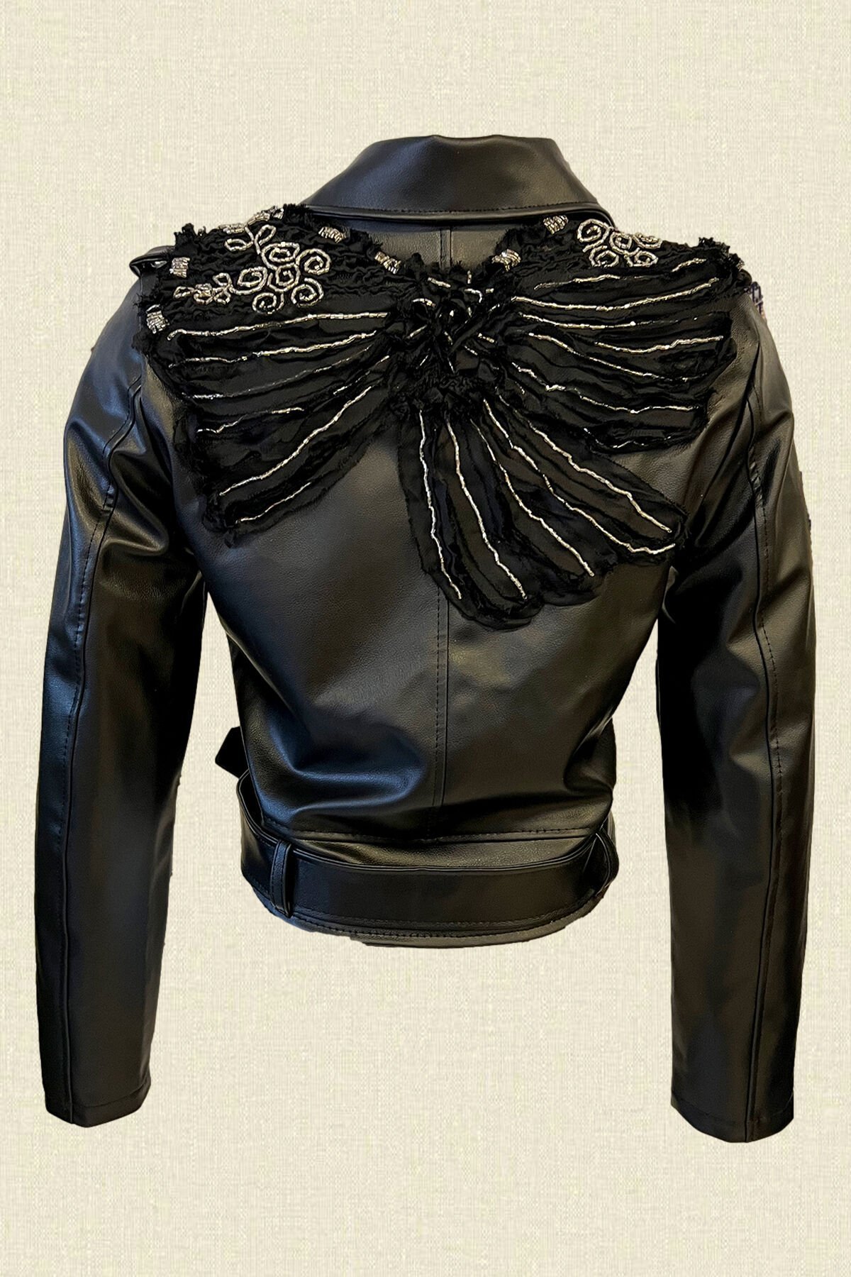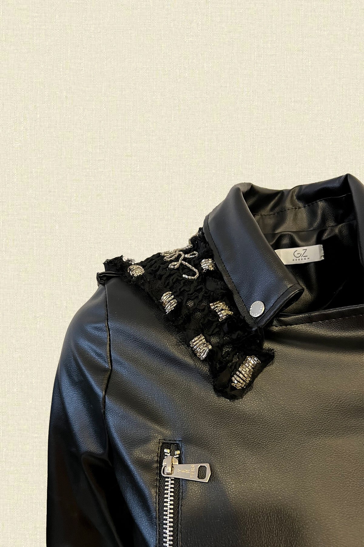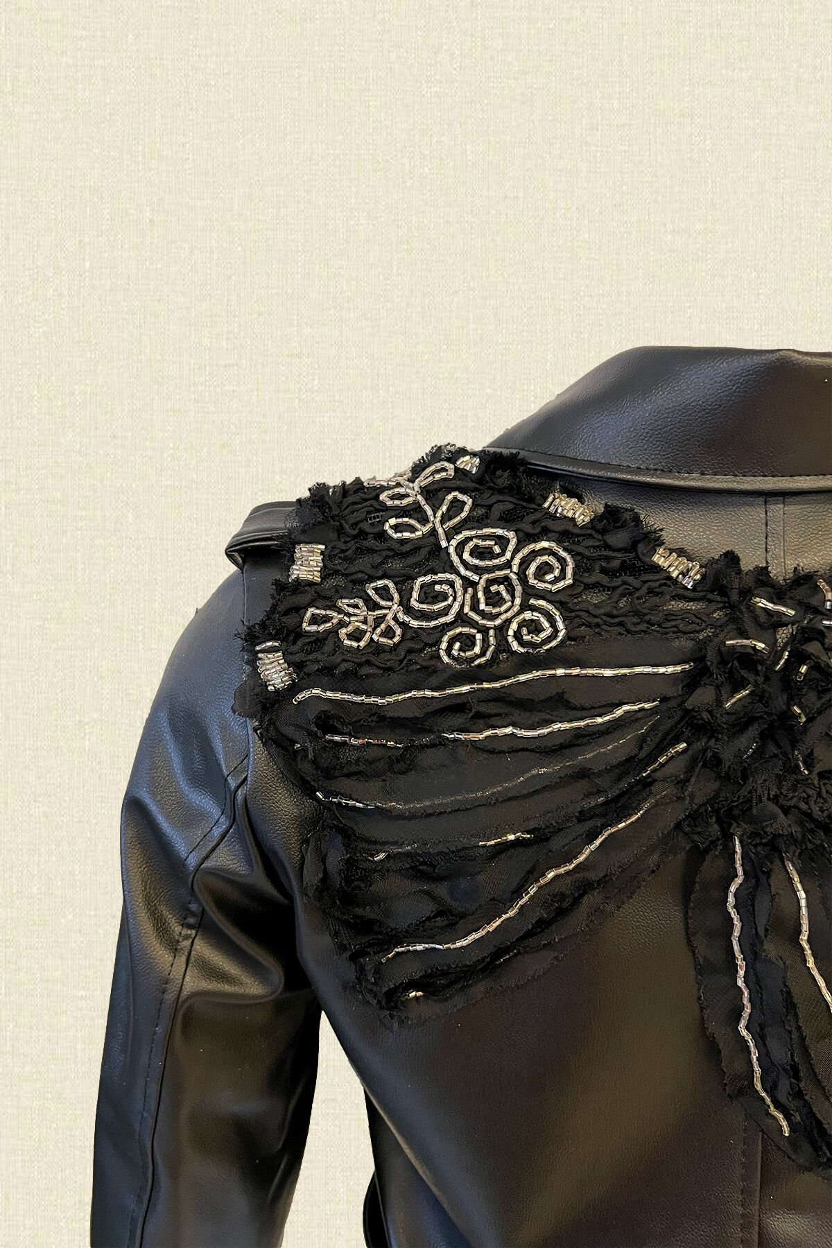 Gümüş Boncuk İşlemeli Siyah Biker Deri Ceket
