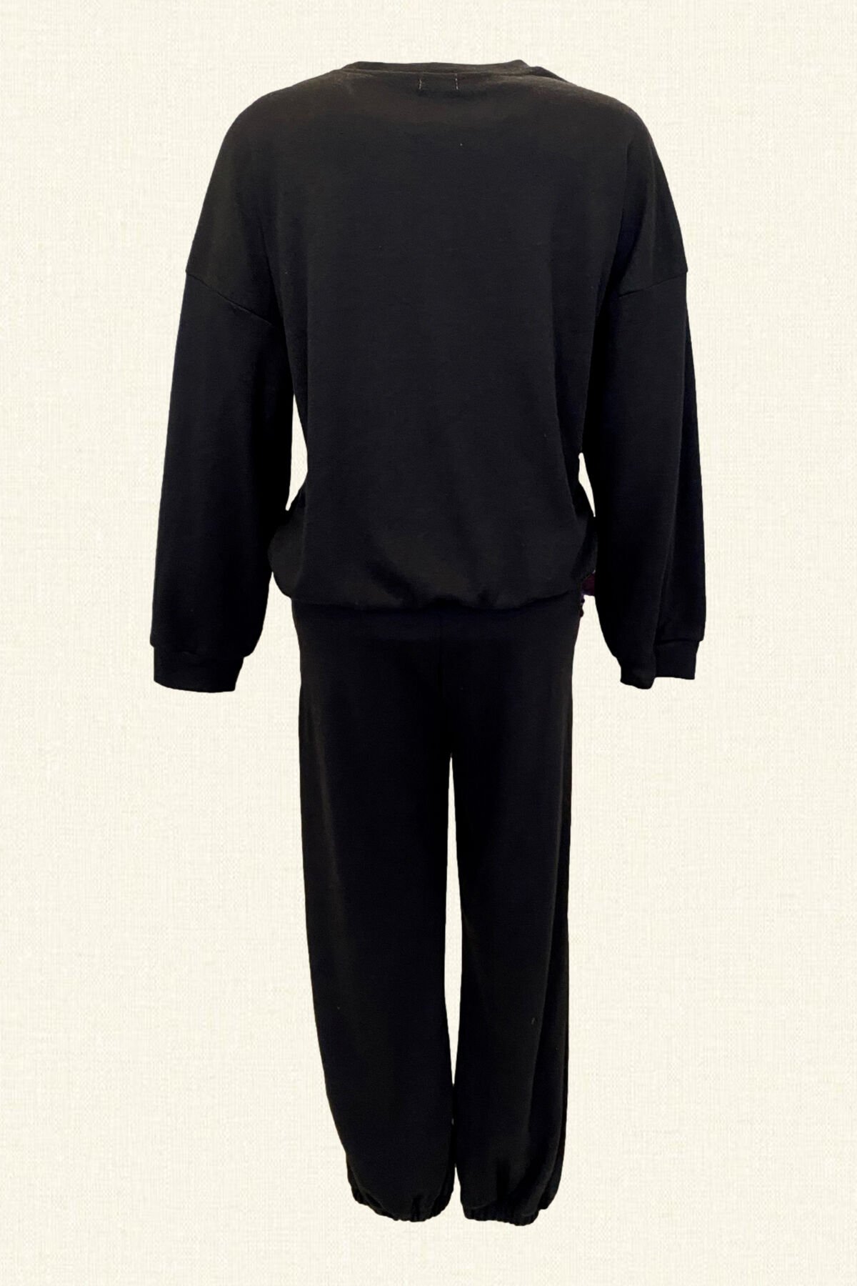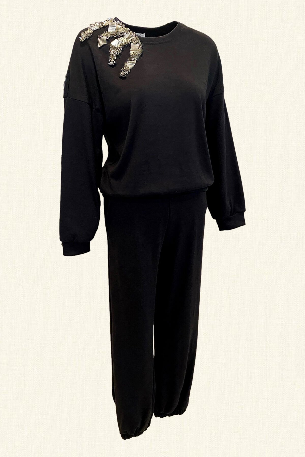 Gümüş boncuklardan yaka kısmında boncuk işlemesi bulunan, paçası lastikli siyah renkli eşofman takımı.