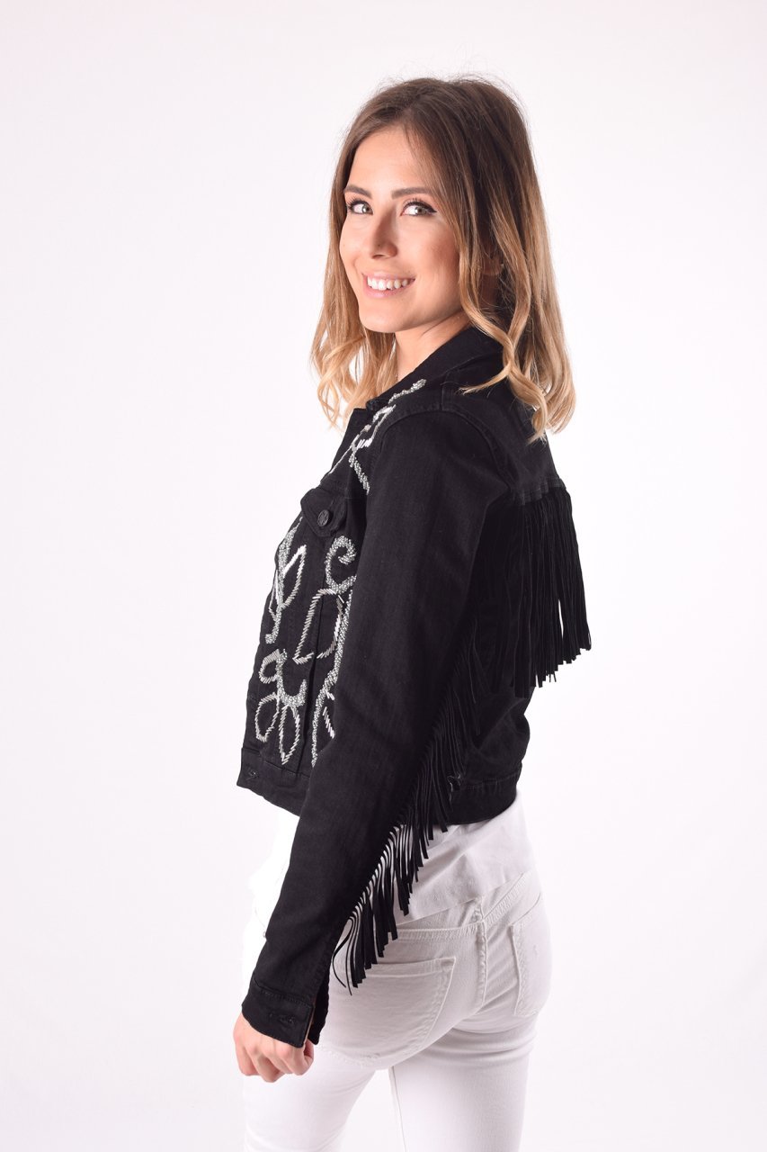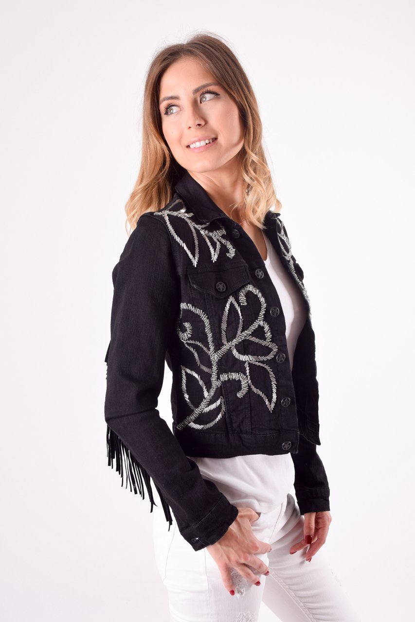 Sırtı kadife püsküllü, gümüş çiçek desenli boncuk işlemeli siyah jean ceket.