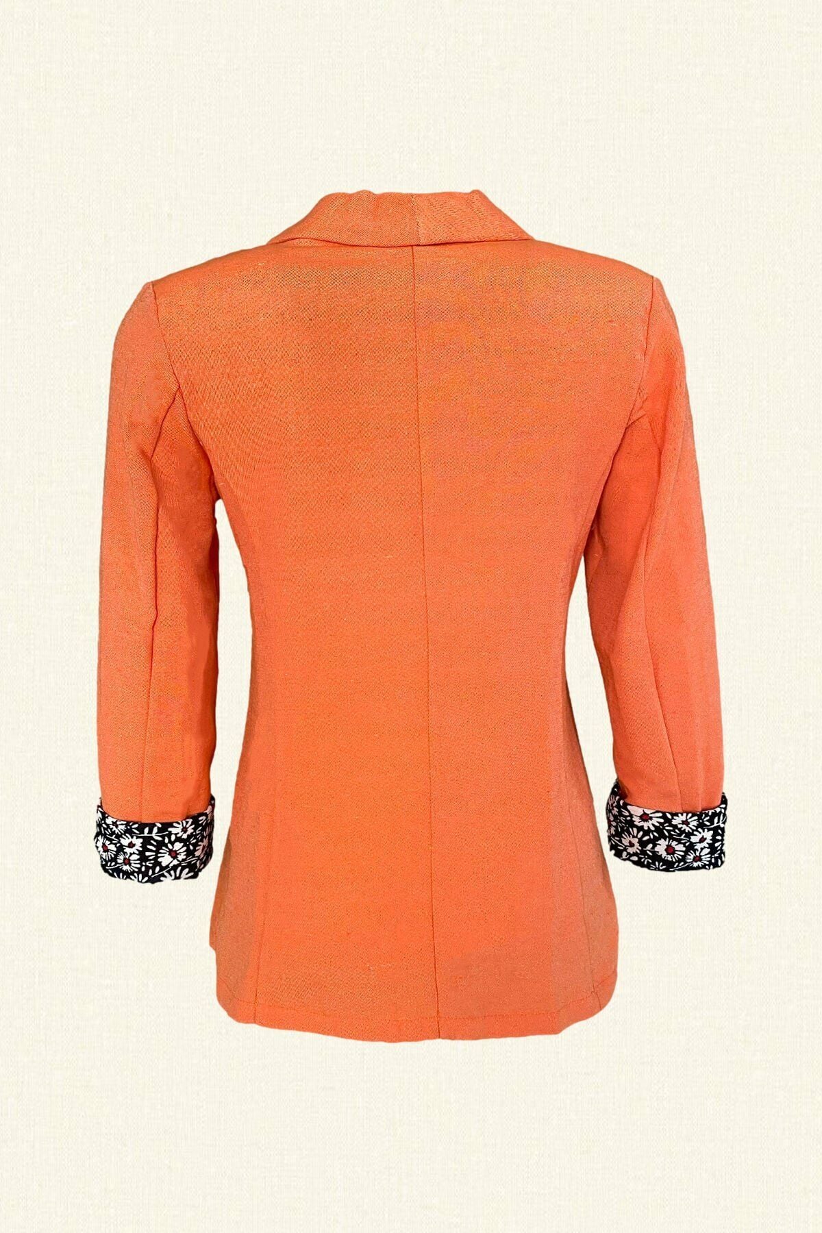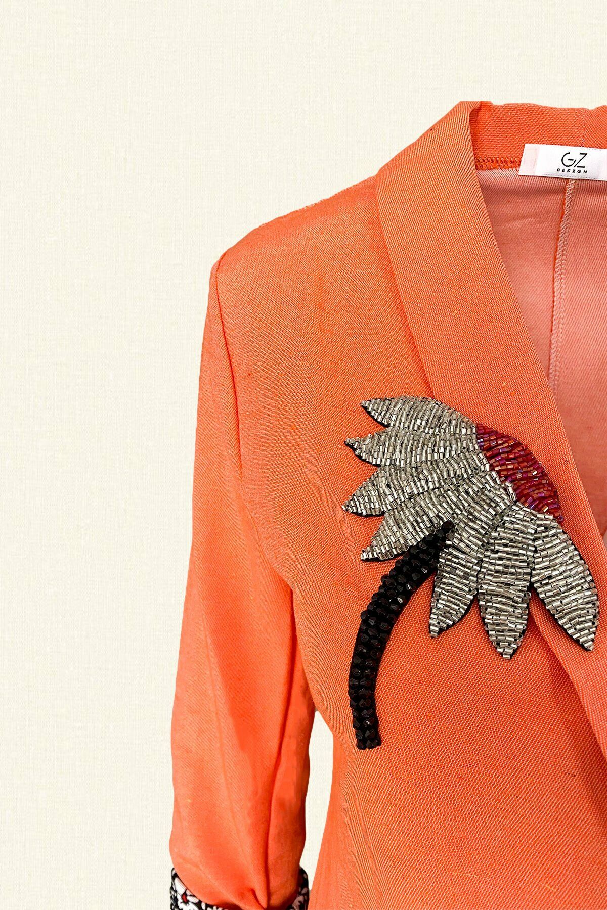 Ön kısmında gümüş boncuklardan işlenmiş çiçek detaylı, tek düğmeli, kolları katlamalı ve papatya desenli turuncu renk keten ceket.
