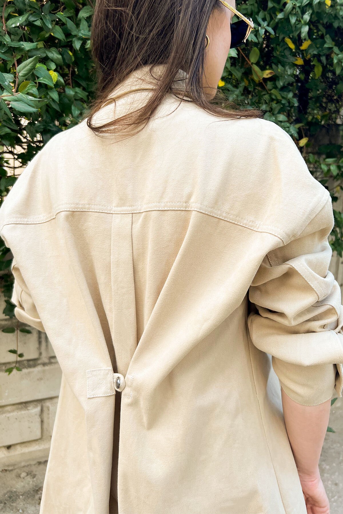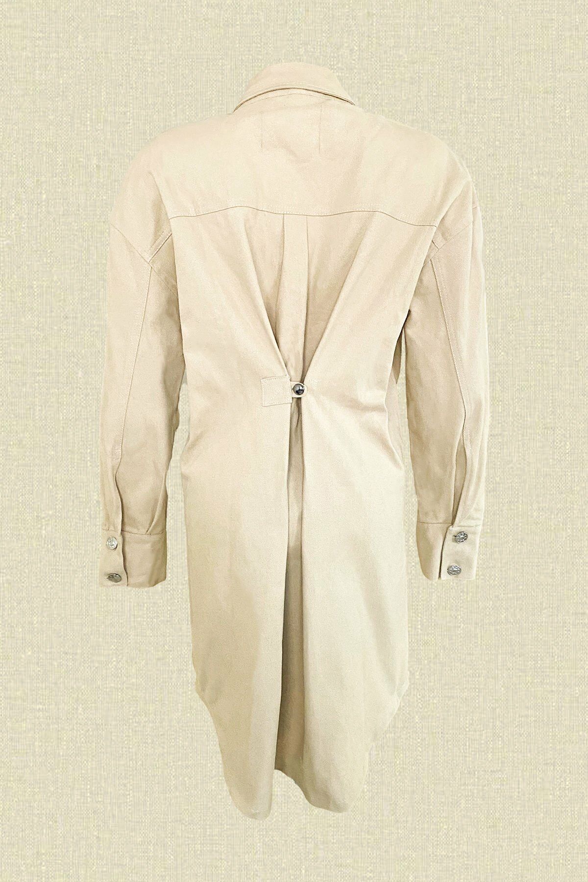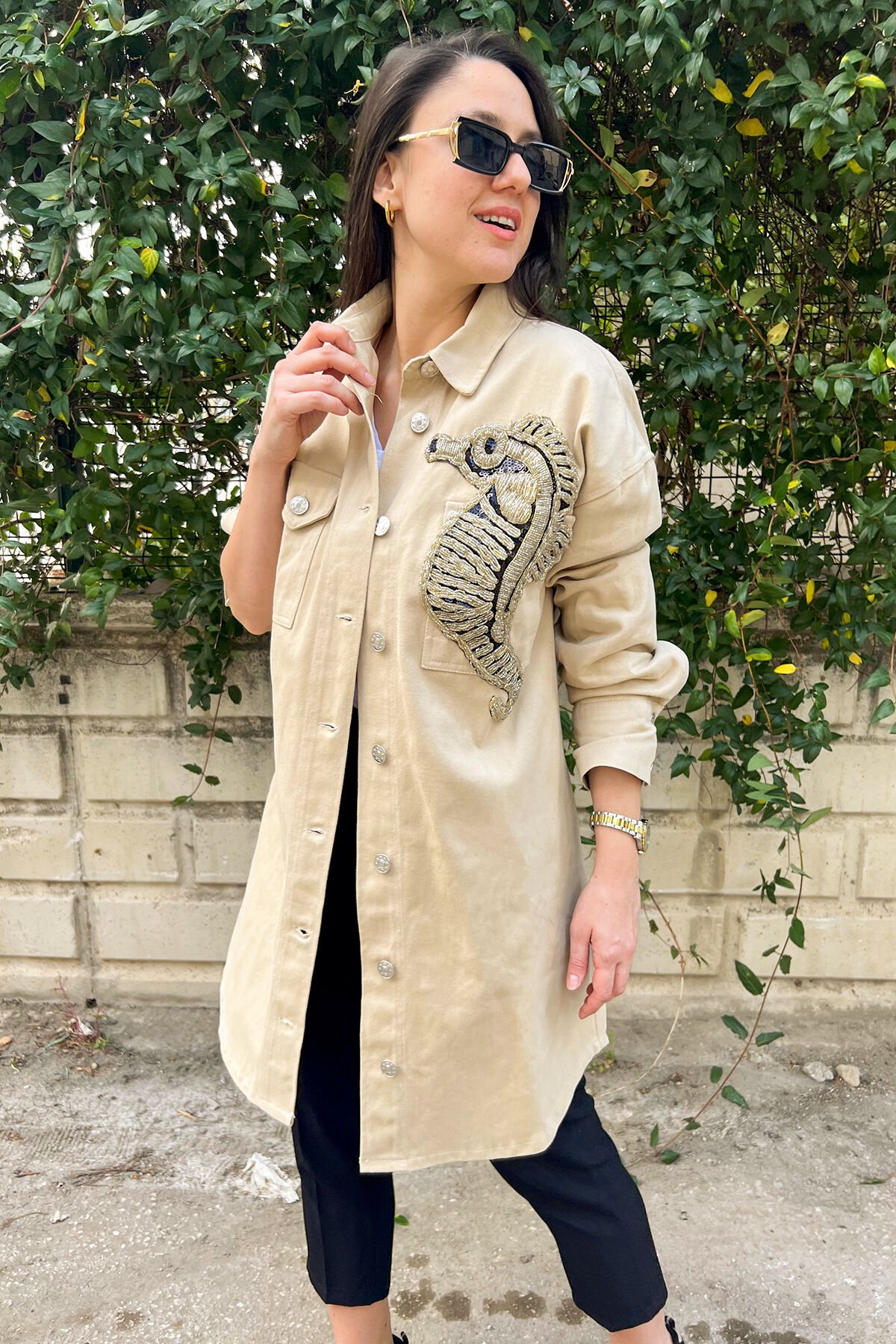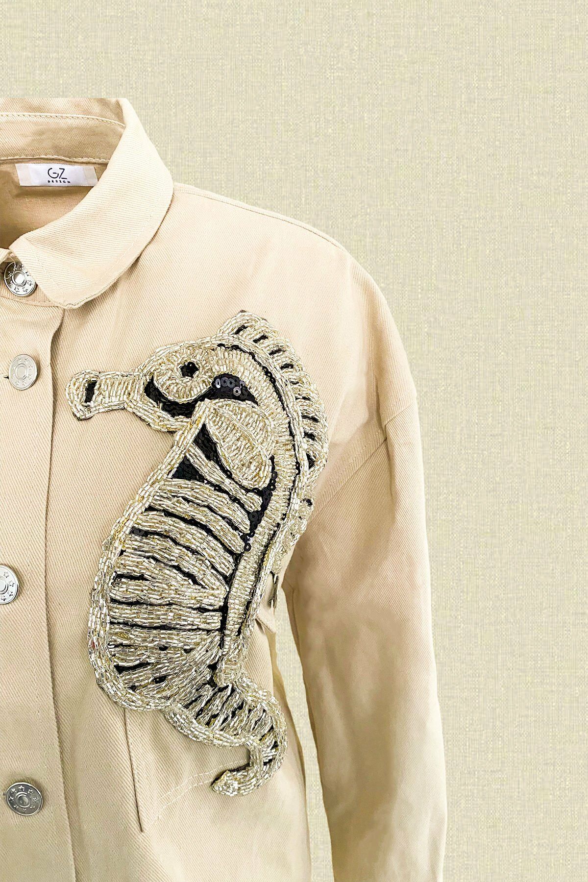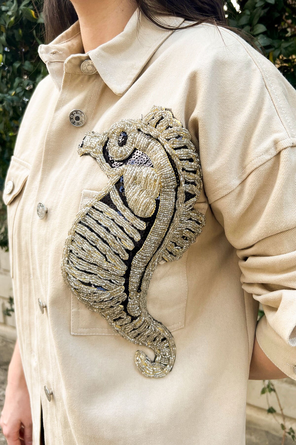 Cep üstünde gümüş boncuk ve kristallerle işlenmiş denizatı detaylı, arka kısmında düğme bulunan uzun krem jean ceket.