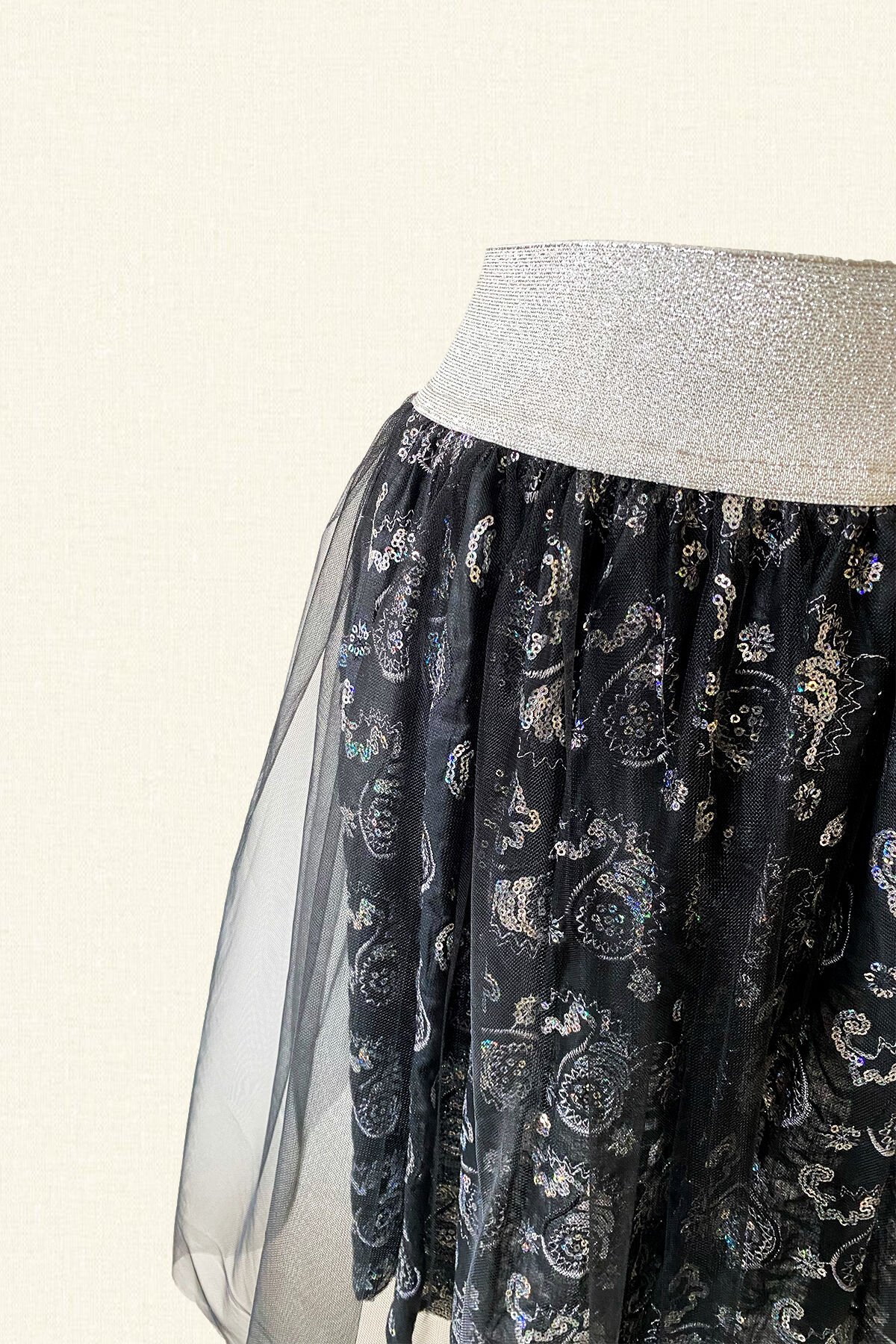 Astarı gümüş çiçek desenli beli lastikli siyah tül etek.