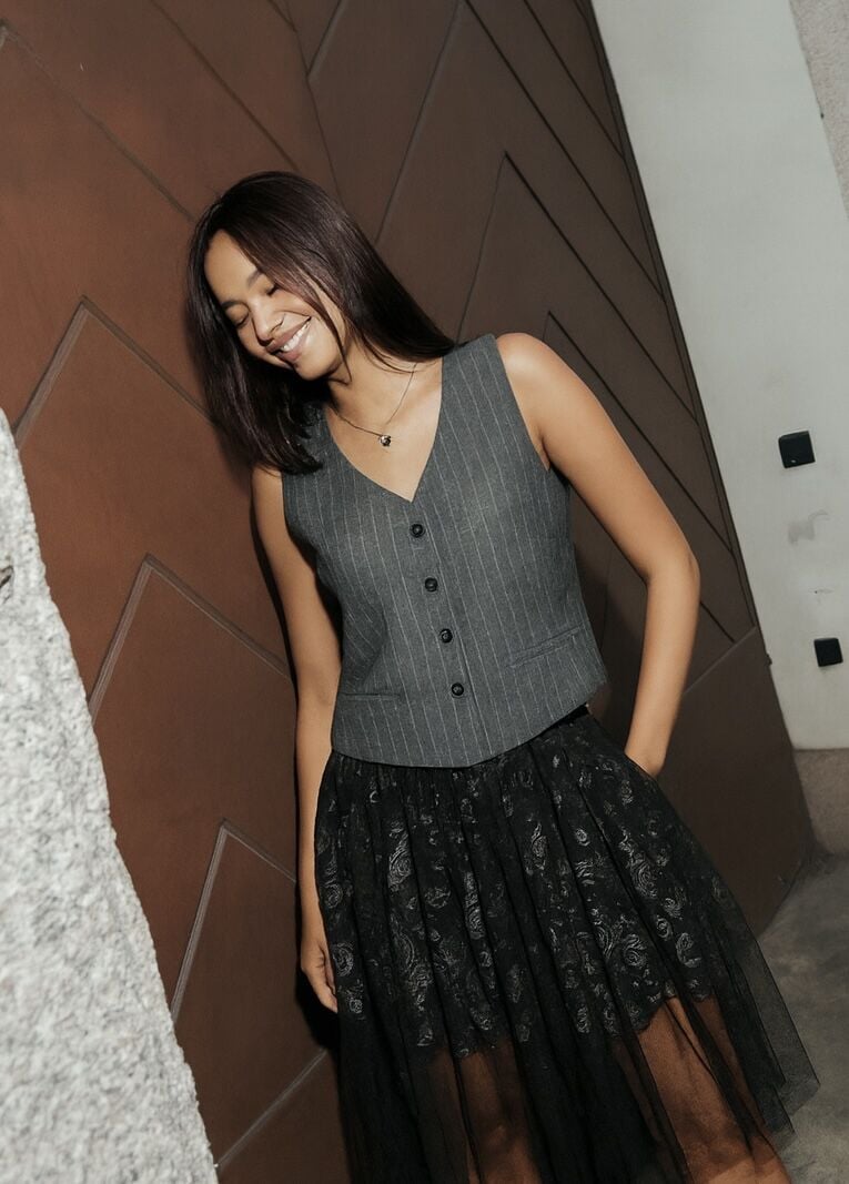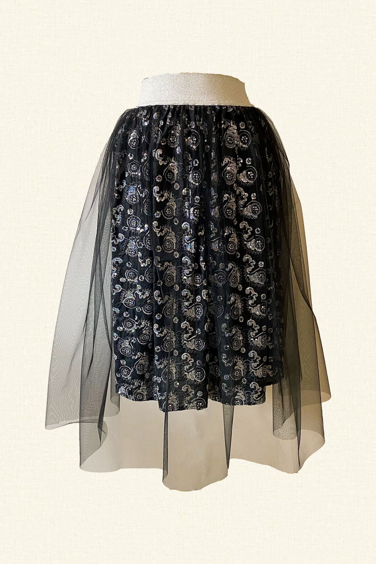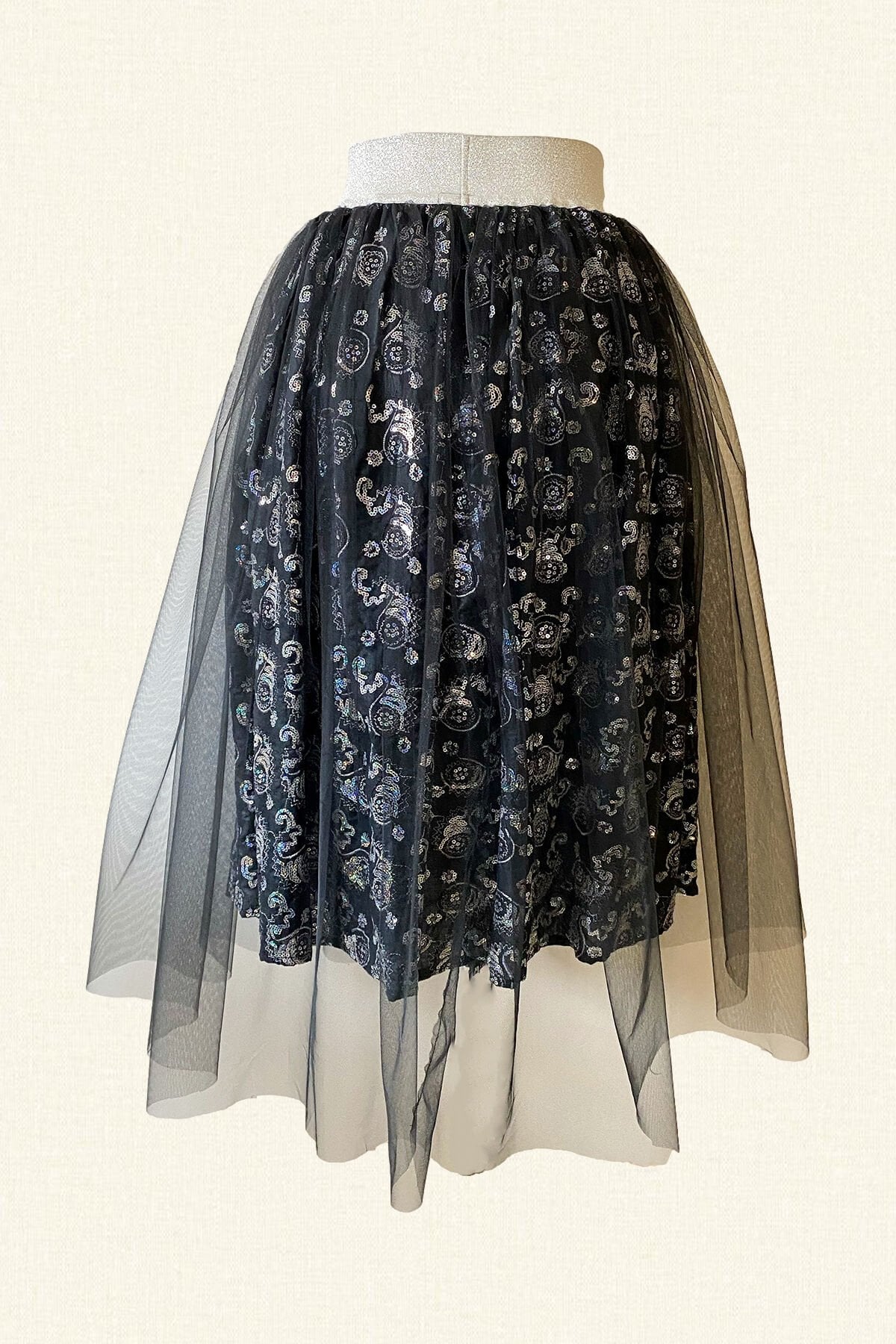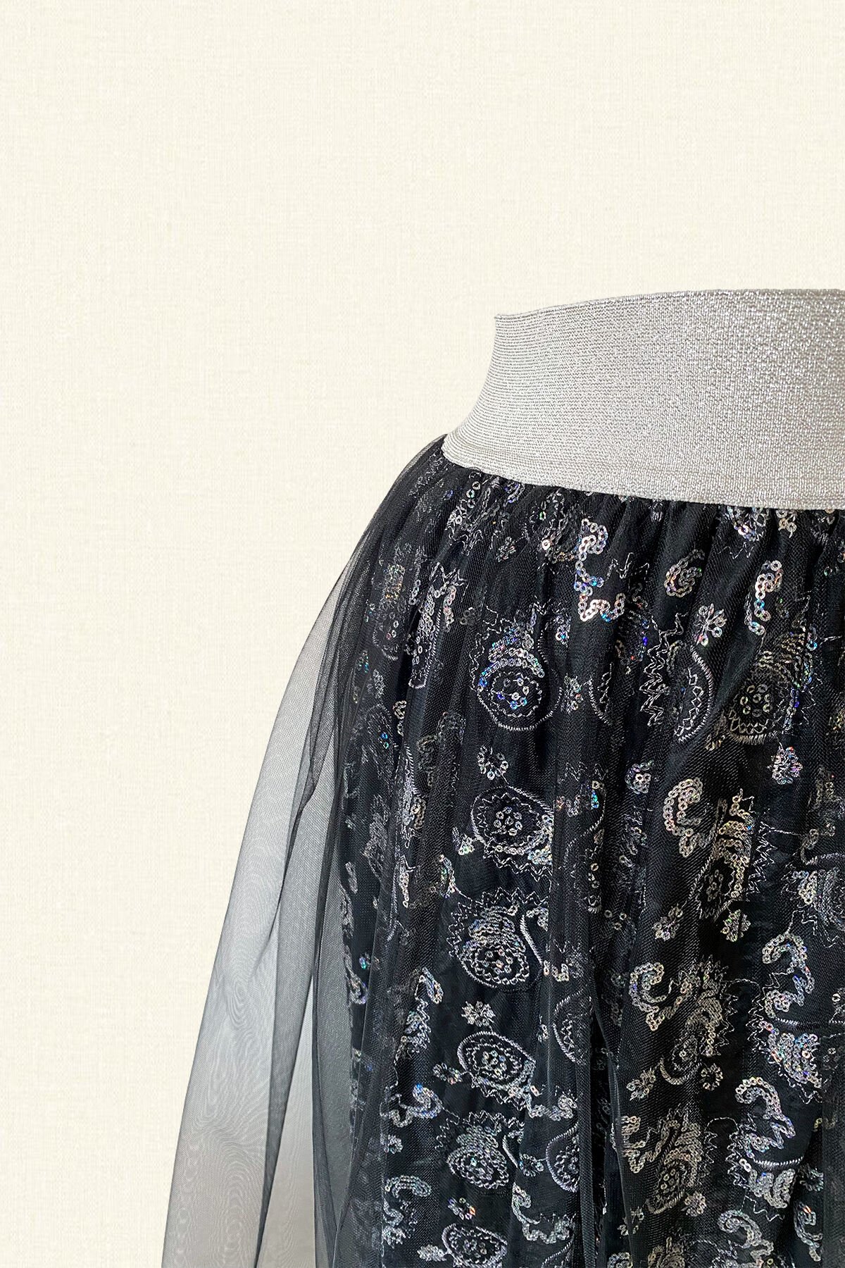 Astarı gümüş çiçek desenli beli lastikli uzun siyah tül etek.