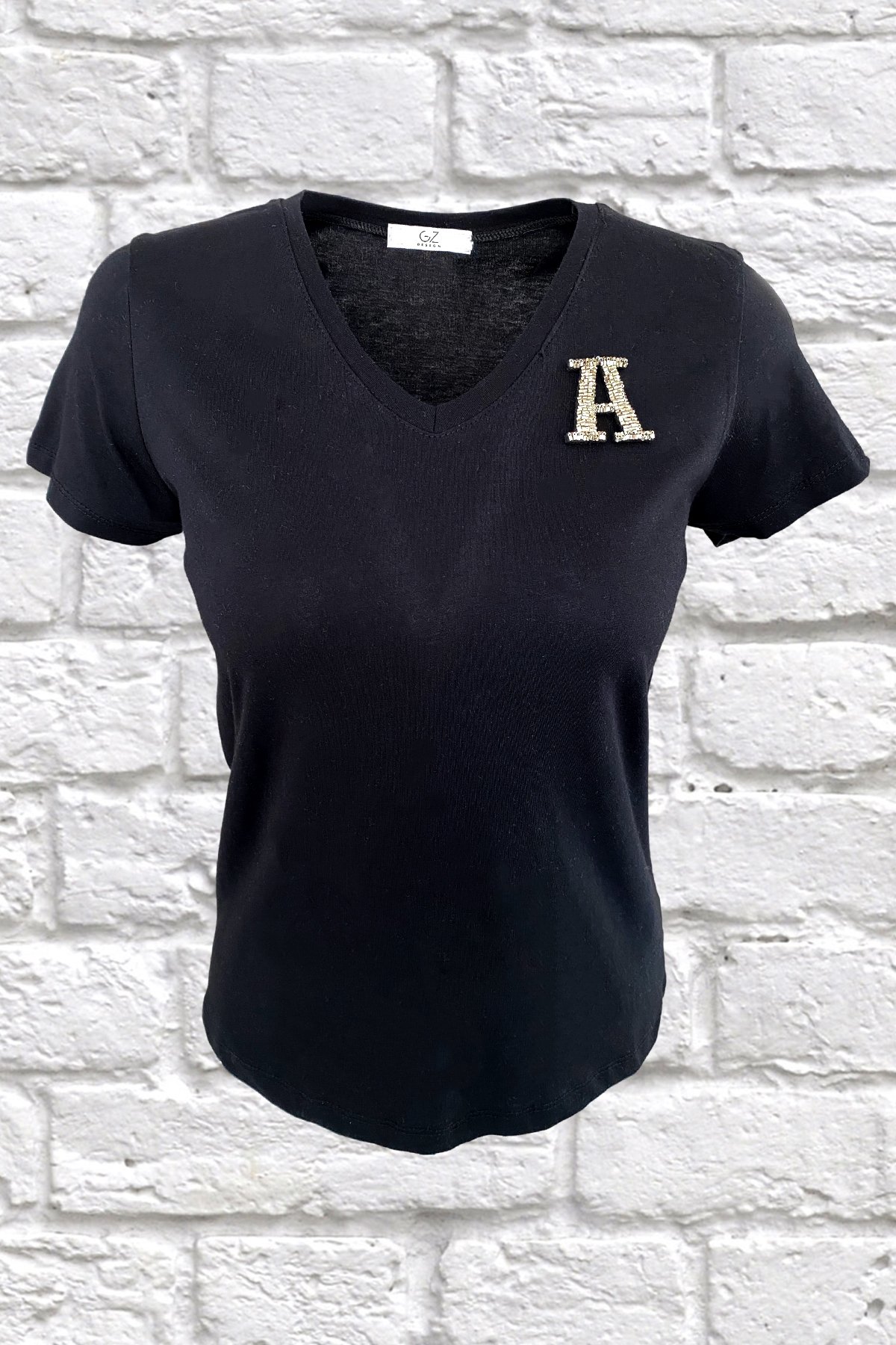 Yaka kısmında gümüş boncuklardan harf işlemesi bulunan, V yaka siyah tişört.