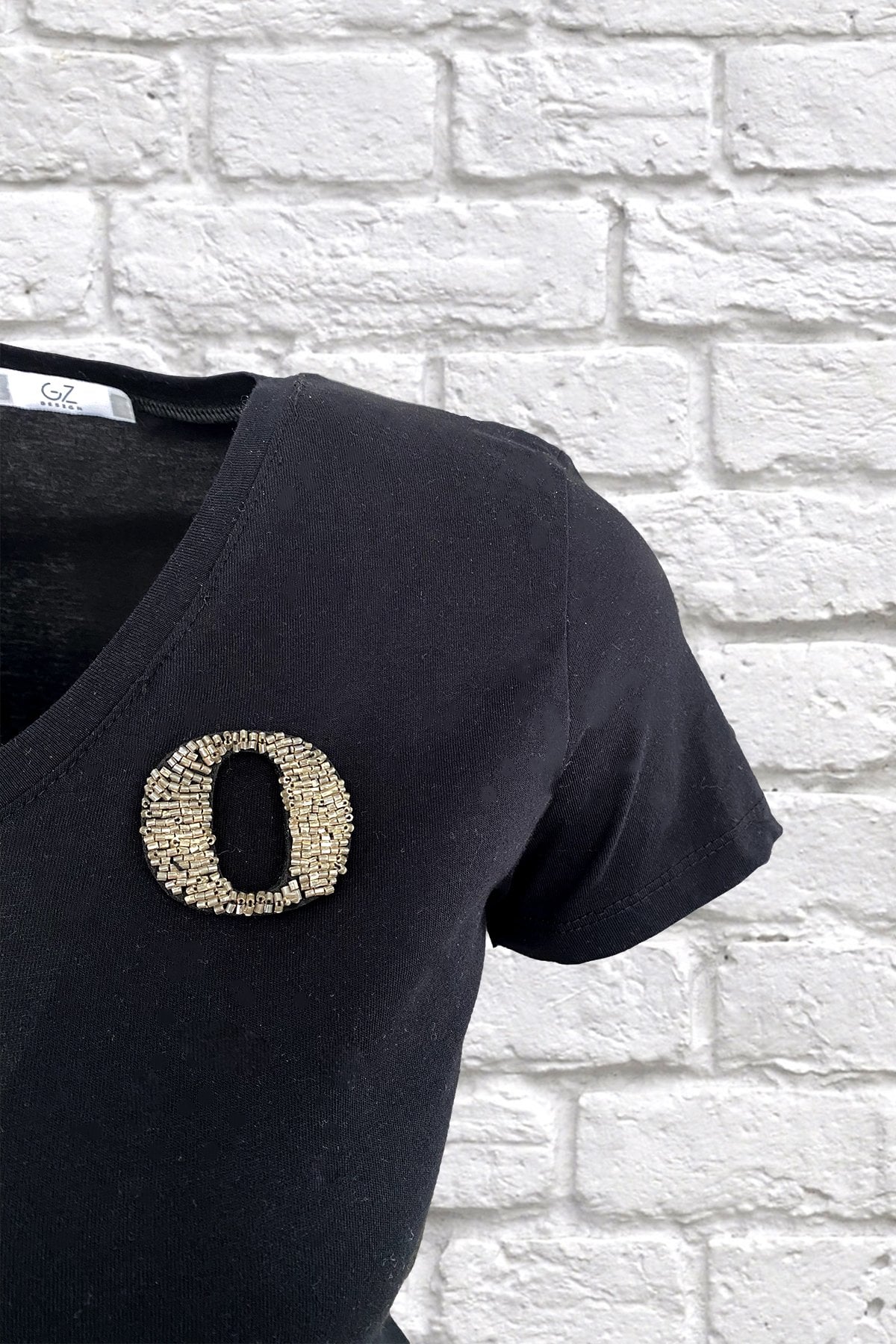Yaka kısmında gümüş boncuklardan harf işlemesi bulunan, V yaka siyah tişört.