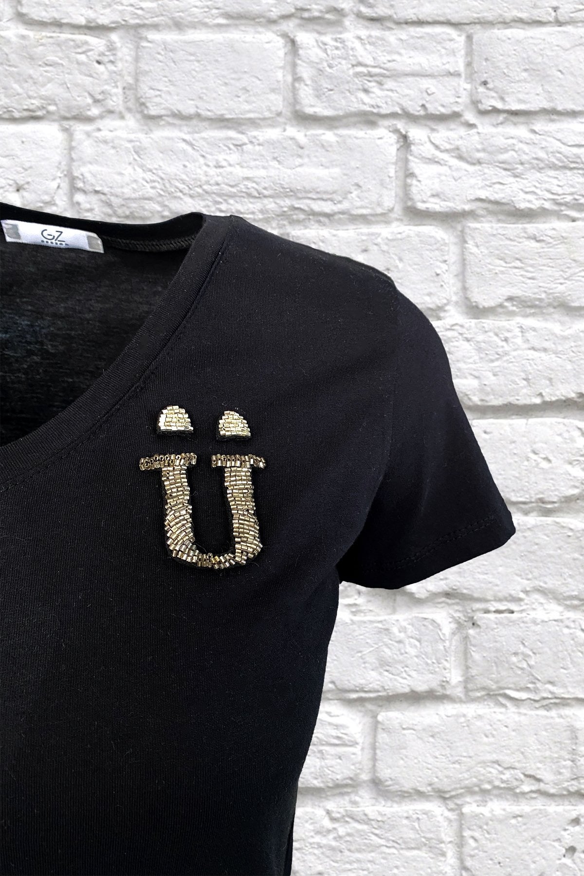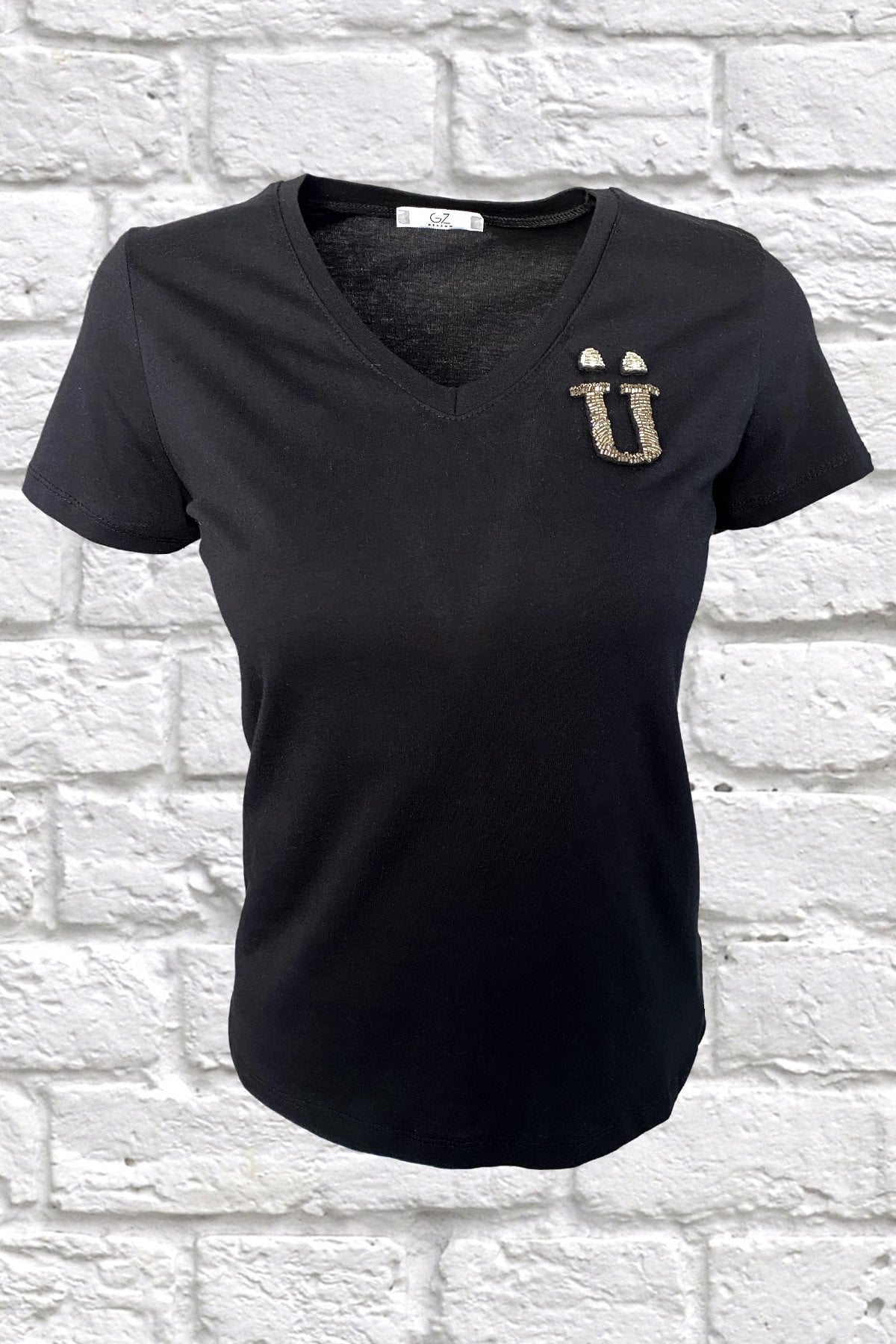 Yaka kısmında gümüş boncuklardan harf işlemesi bulunan, V yaka siyah tişört.