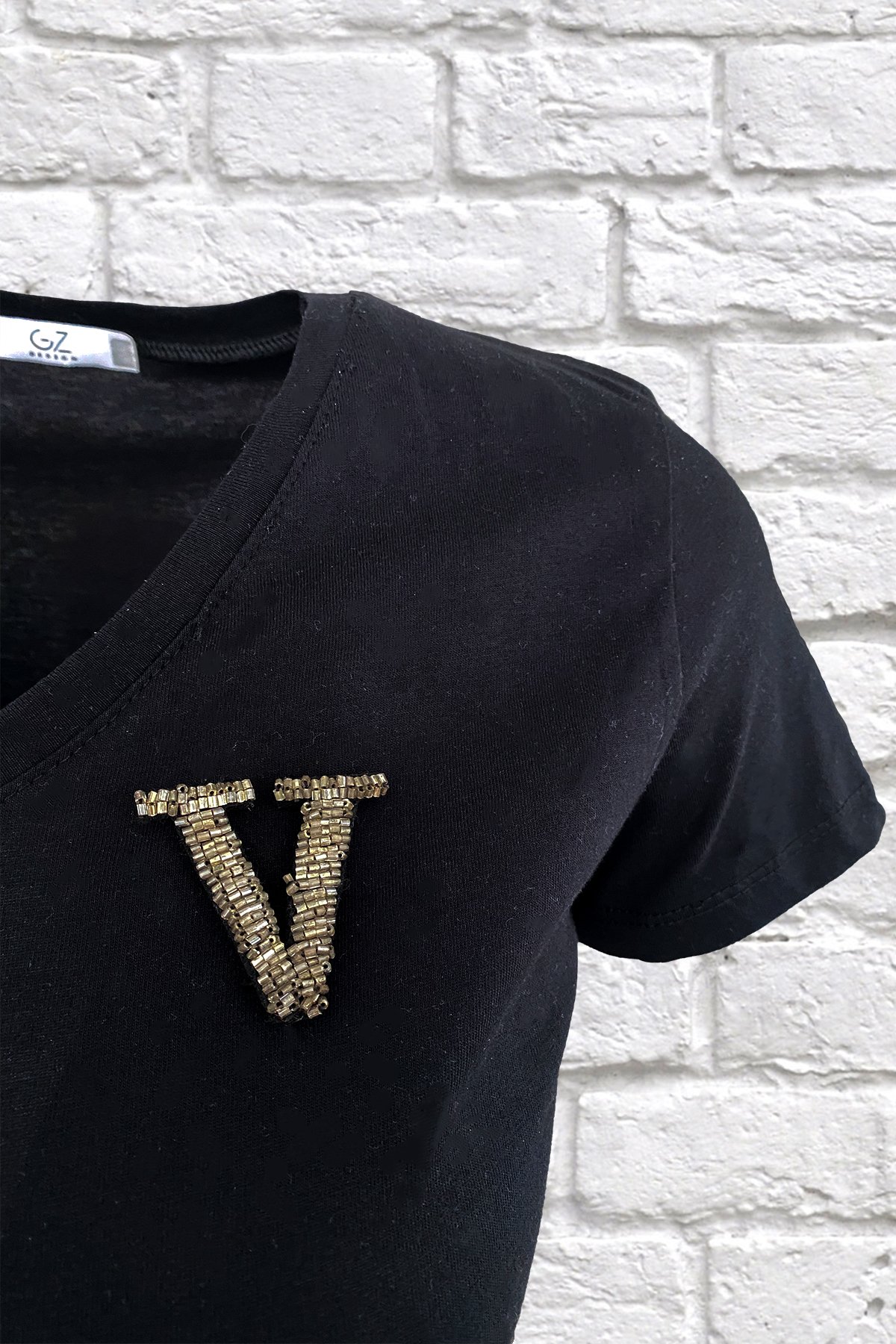 Yaka kısmında gümüş boncuklardan harf işlemesi bulunan, V yaka siyah tişört.