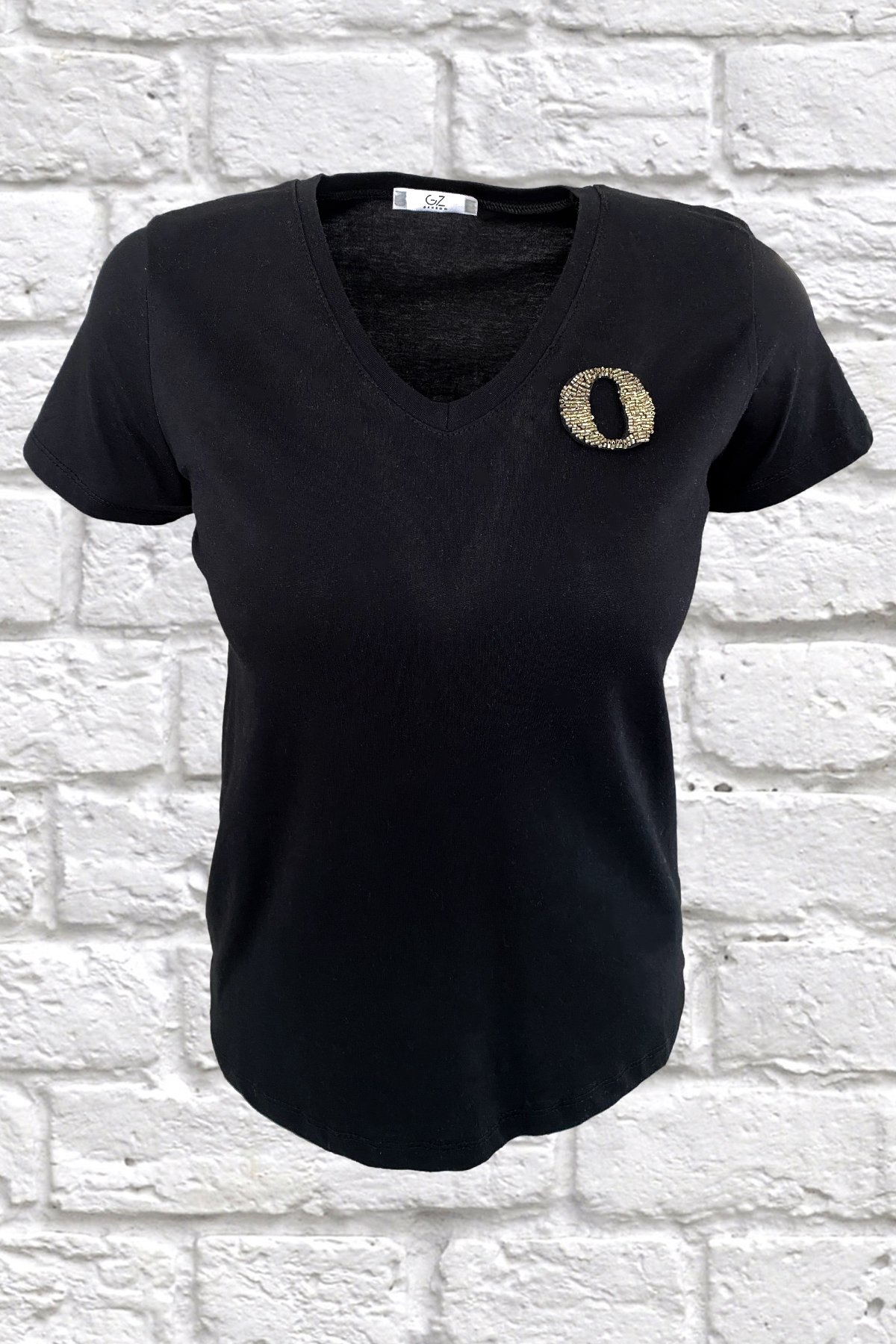 Yaka kısmında gümüş boncuklardan harf işlemesi bulunan, V yaka siyah tişört.