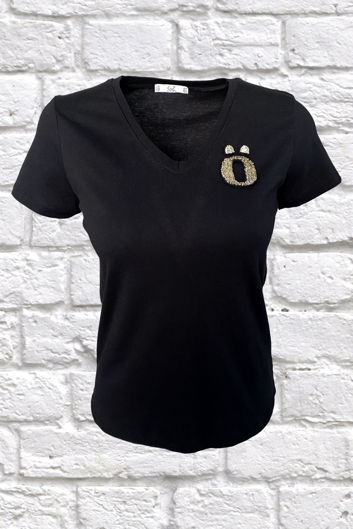 Yaka kısmında gümüş boncuklardan harf işlemesi bulunan, V yaka siyah tişört.