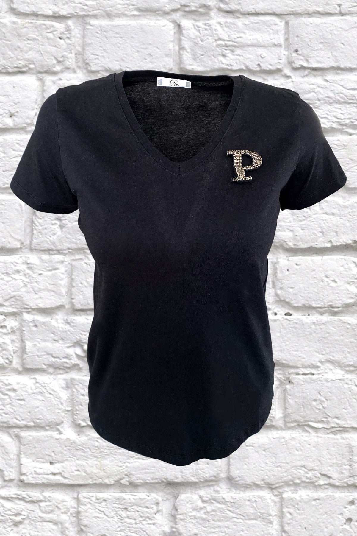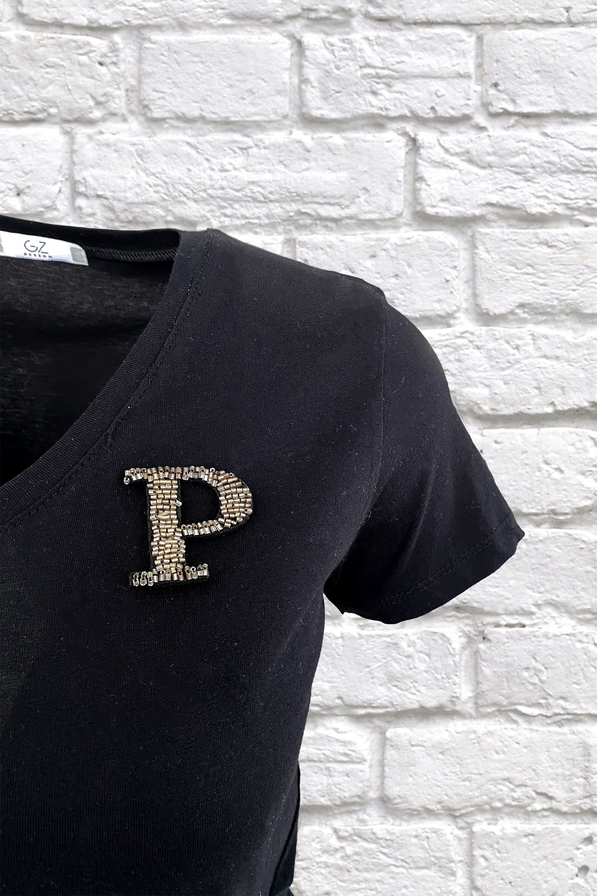 Yaka kısmında gümüş boncuklardan harf işlemesi bulunan, V yaka siyah tişört.
