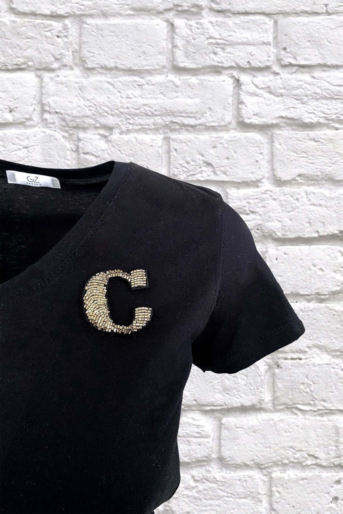 Yaka kısmında gümüş boncuklardan harf işlemesi bulunan, V yaka siyah tişört.