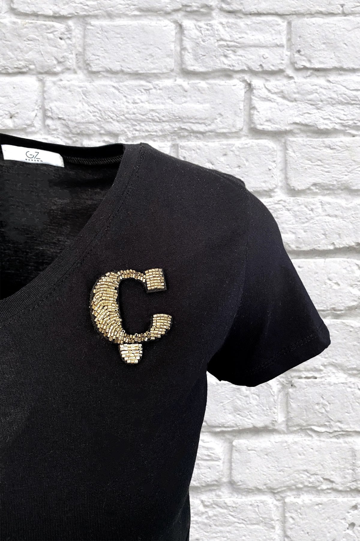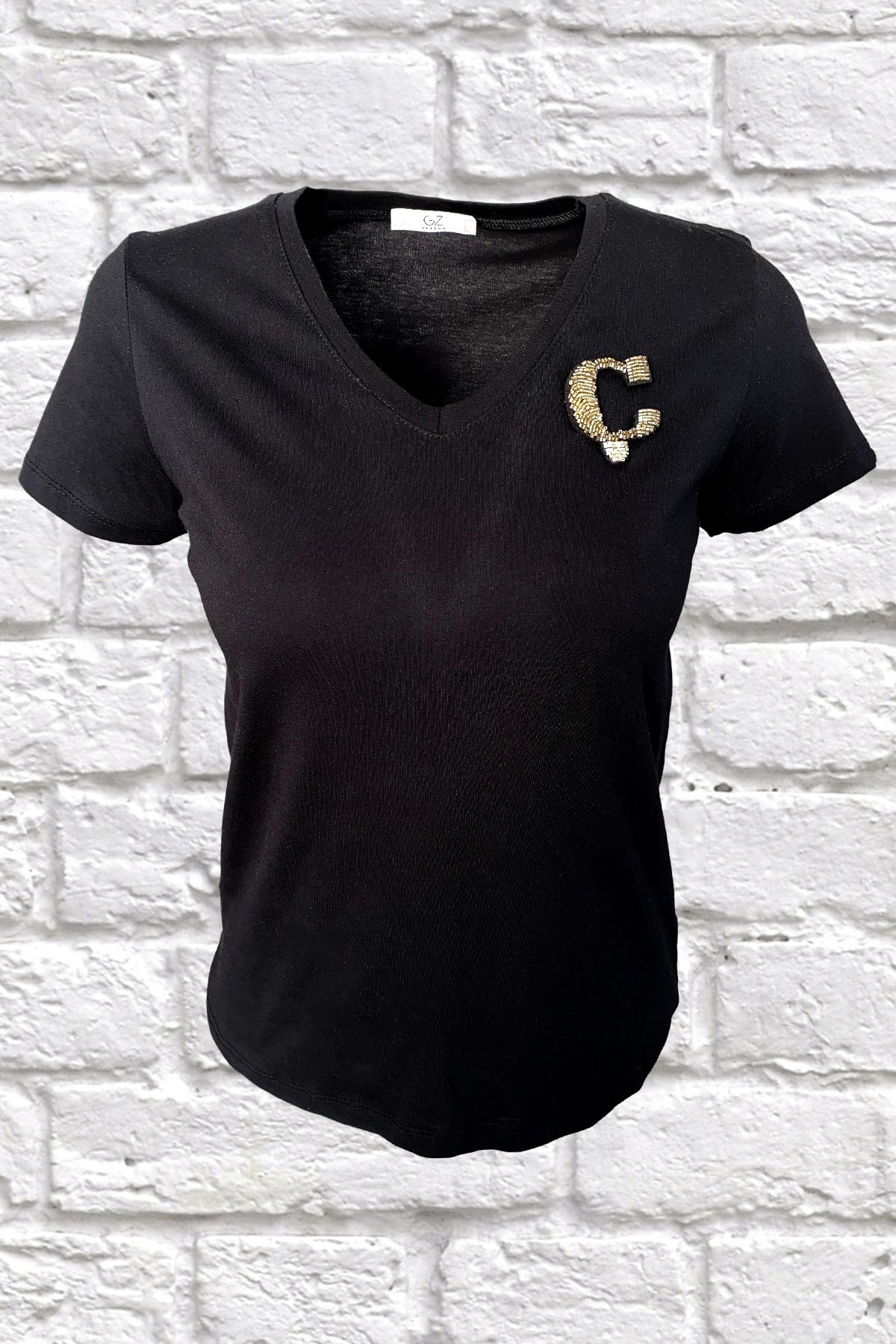 Yaka kısmında gümüş boncuklardan harf işlemesi bulunan, V yaka siyah tişört.