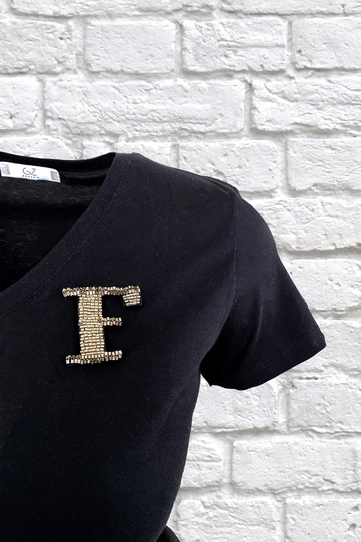 Yaka kısmında gümüş boncuklardan harf işlemesi bulunan, V yaka siyah tişört.