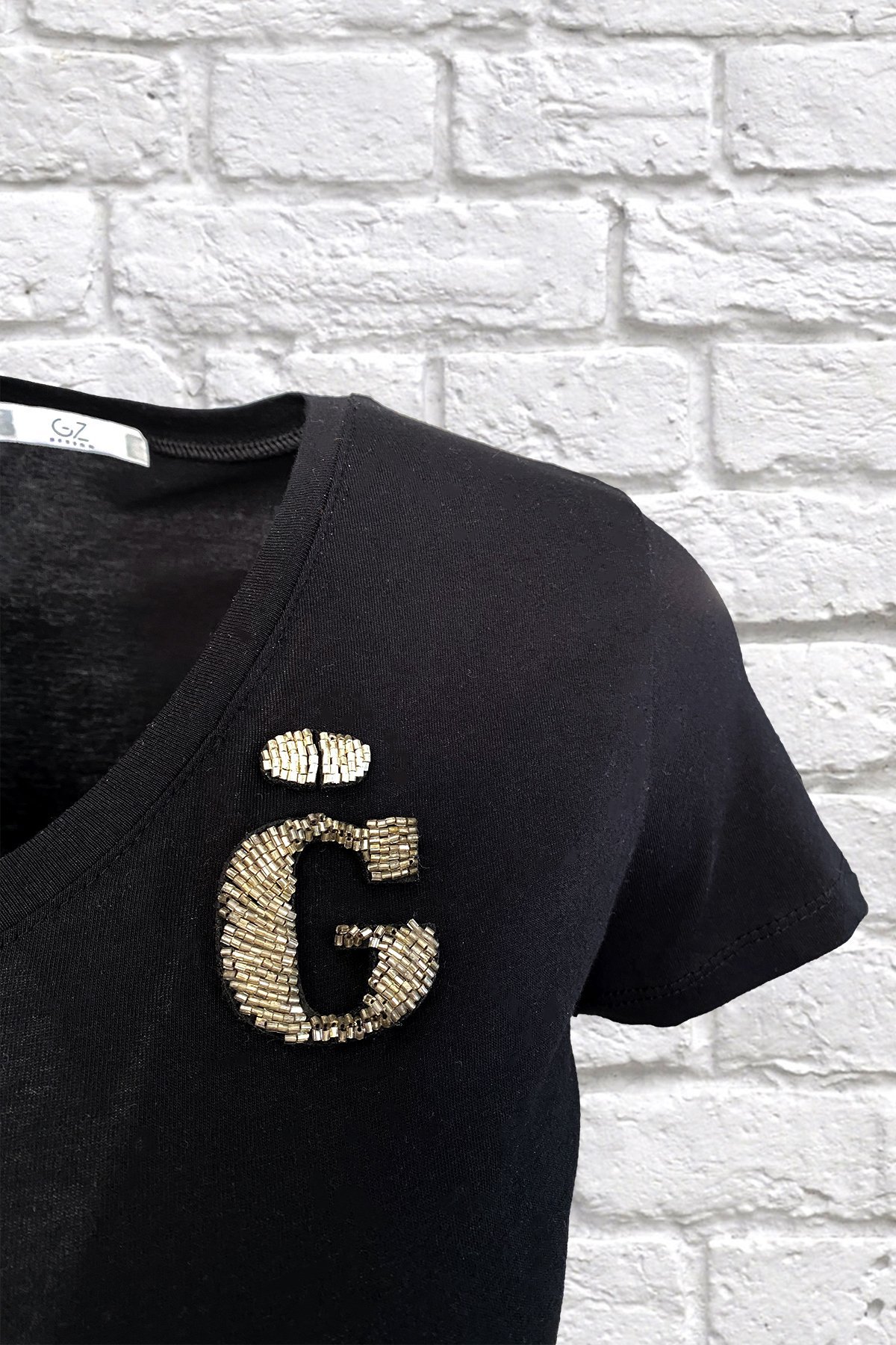Yaka kısmında gümüş boncuklardan harf işlemesi bulunan, V yaka siyah tişört.