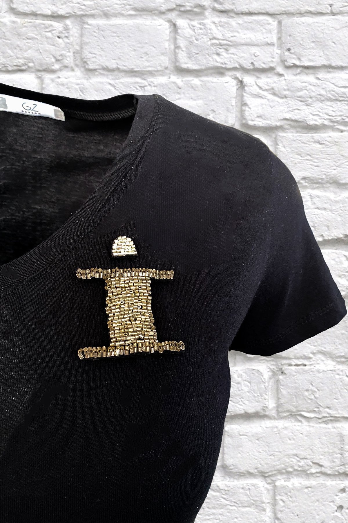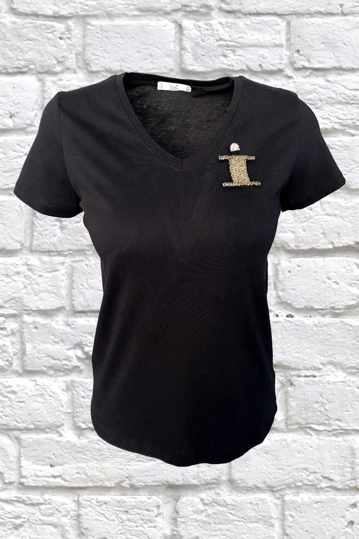 Yaka kısmında gümüş boncuklardan harf işlemesi bulunan, V yaka siyah tişört.