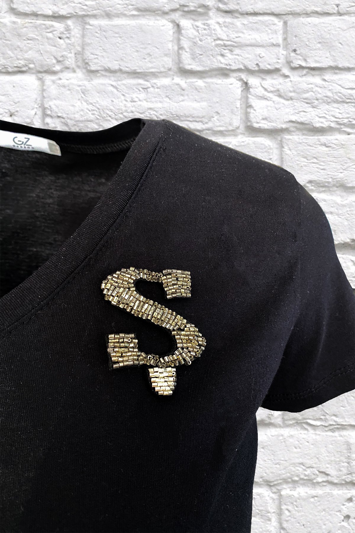 Yaka kısmında gümüş boncuklardan harf işlemesi bulunan, V yaka siyah tişört.