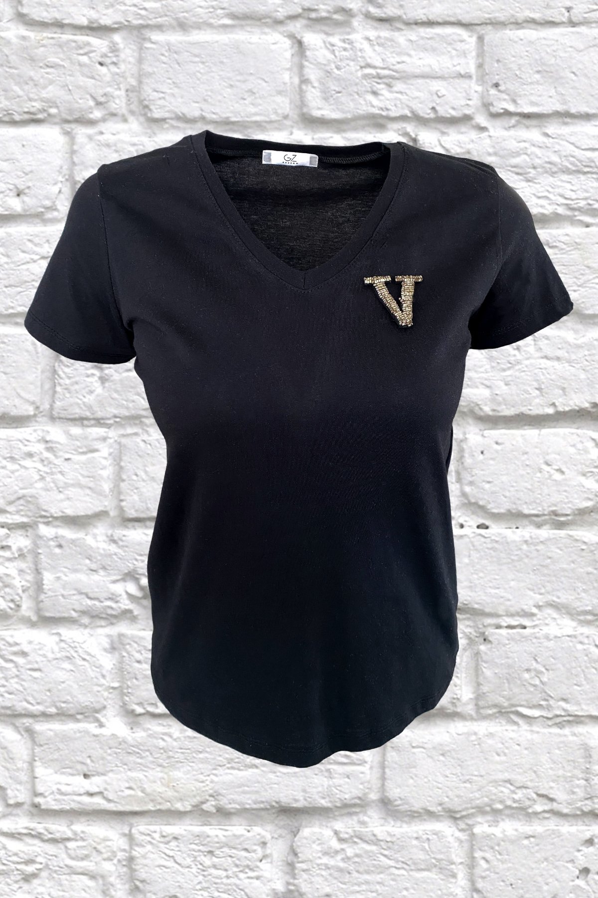 Yaka kısmında gümüş boncuklardan harf işlemesi bulunan, V yaka siyah tişört.
