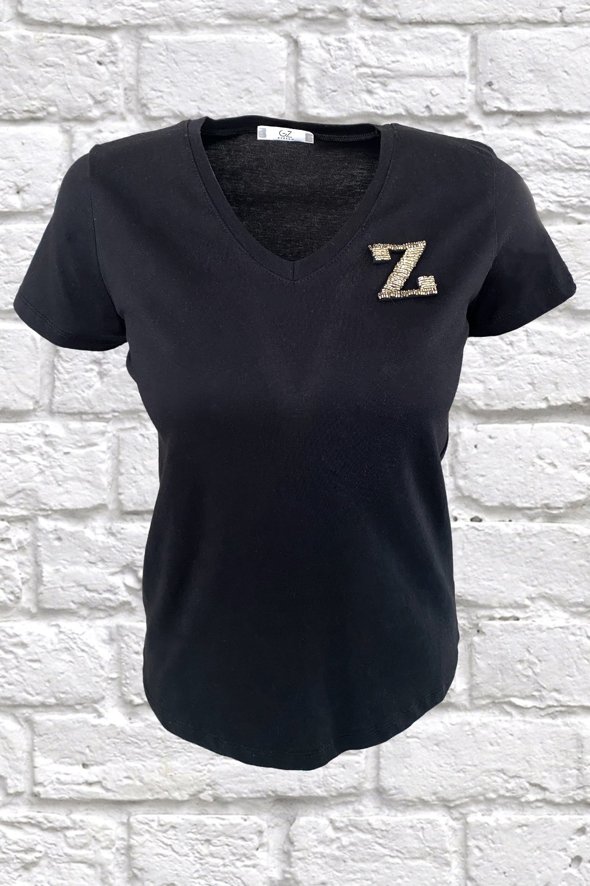 Yaka kısmında gümüş boncuklardan harf işlemesi bulunan, V yaka siyah tişört.
