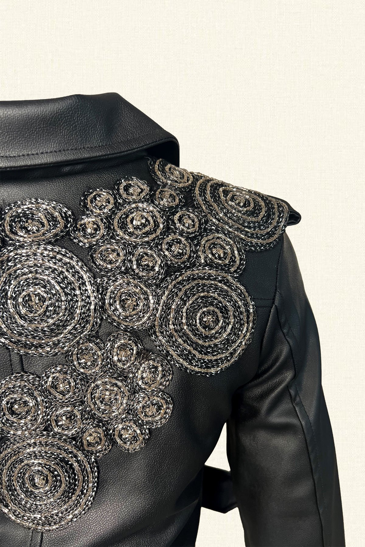 Sırt kısmından omuz kısmına gelen, yuvarlak figürlü, gümüş renkli boncuklardan işlemesi bulunan,kemer detaylı suni siyah deri ceket.