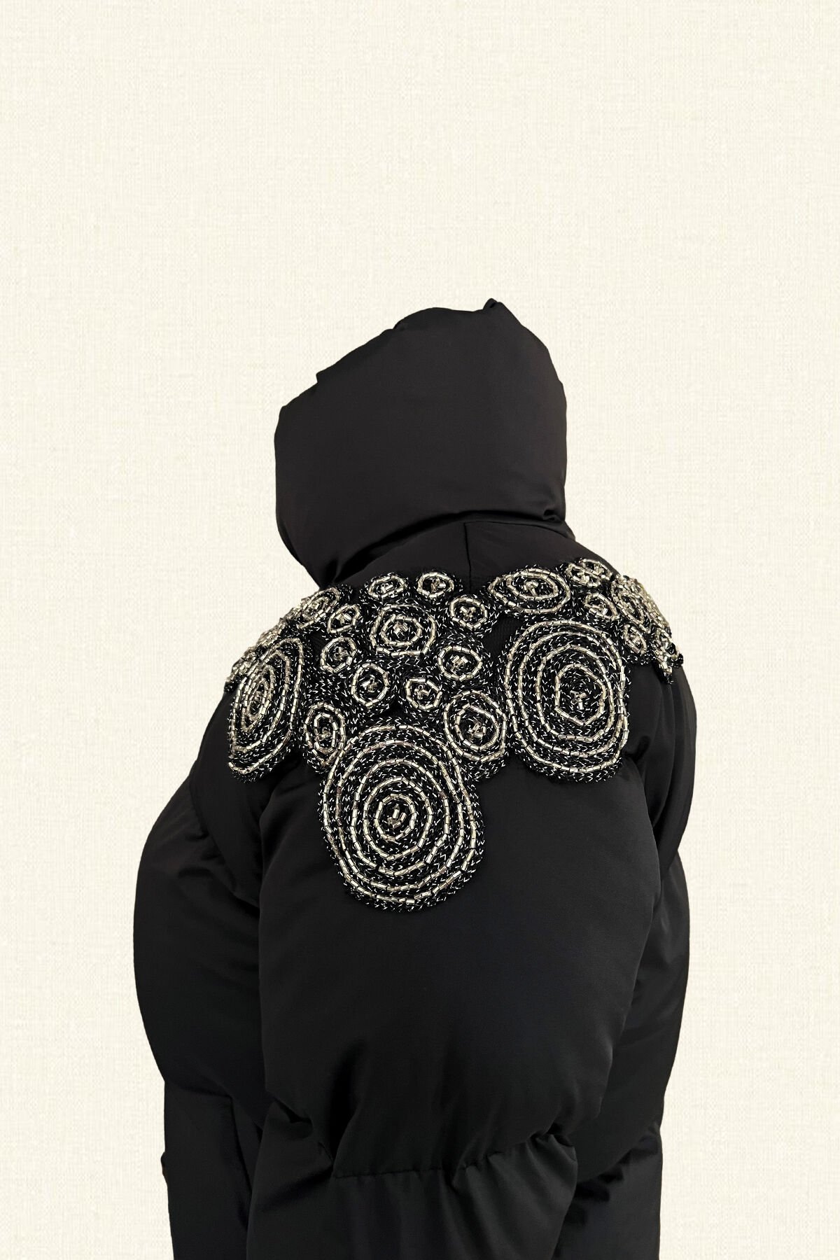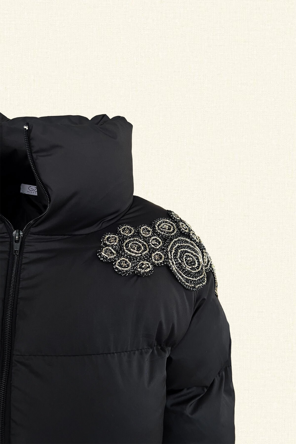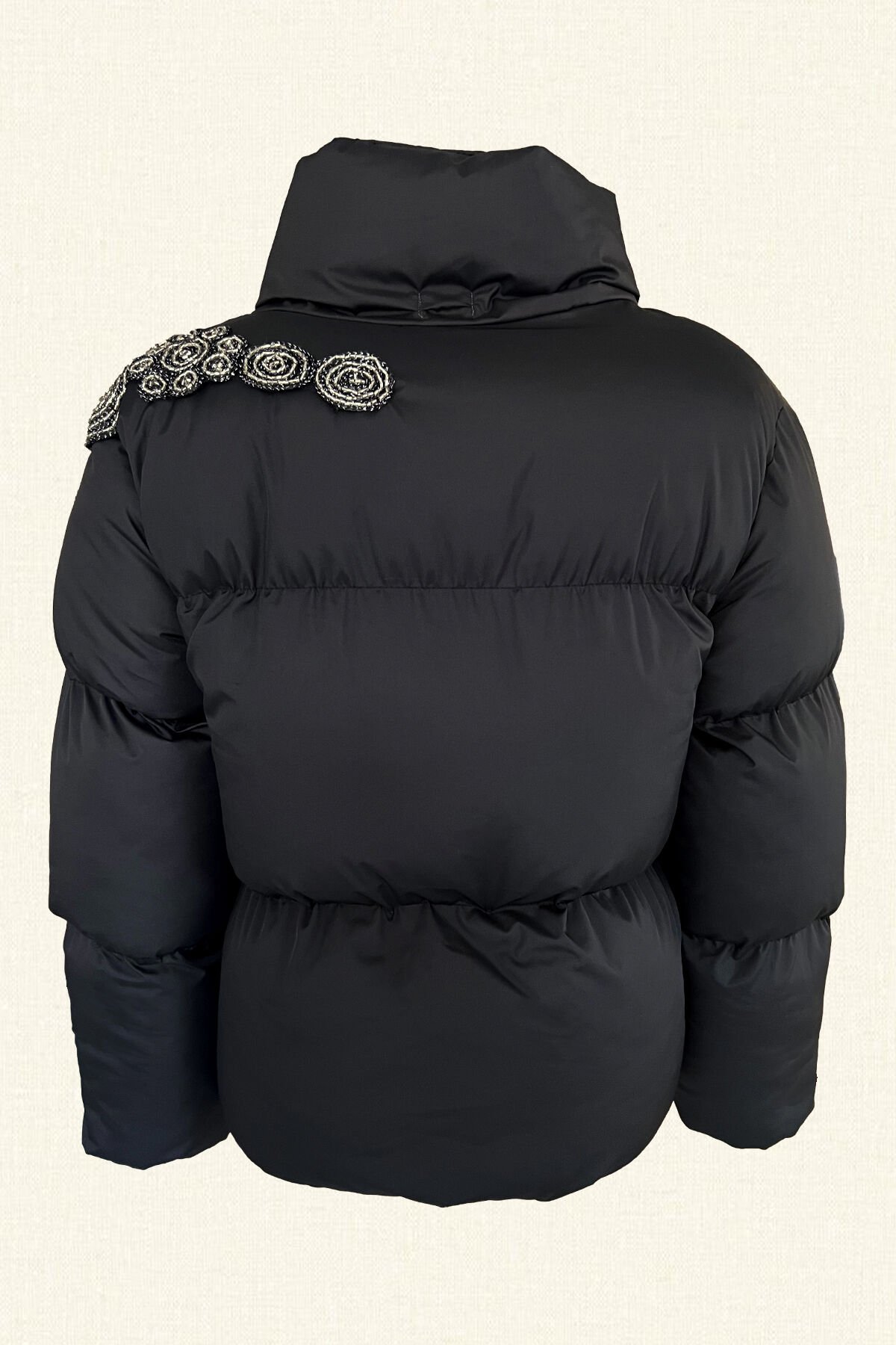 Yakasında kristal boncuk işlemeli  siyah şişme mont.