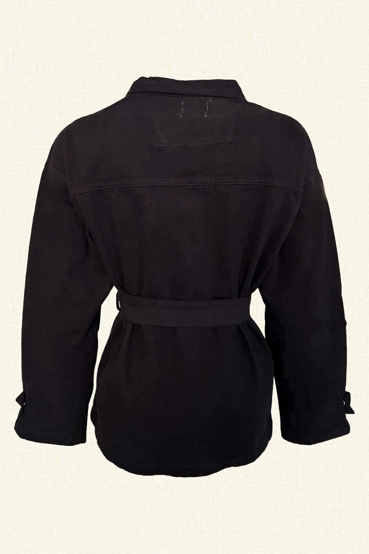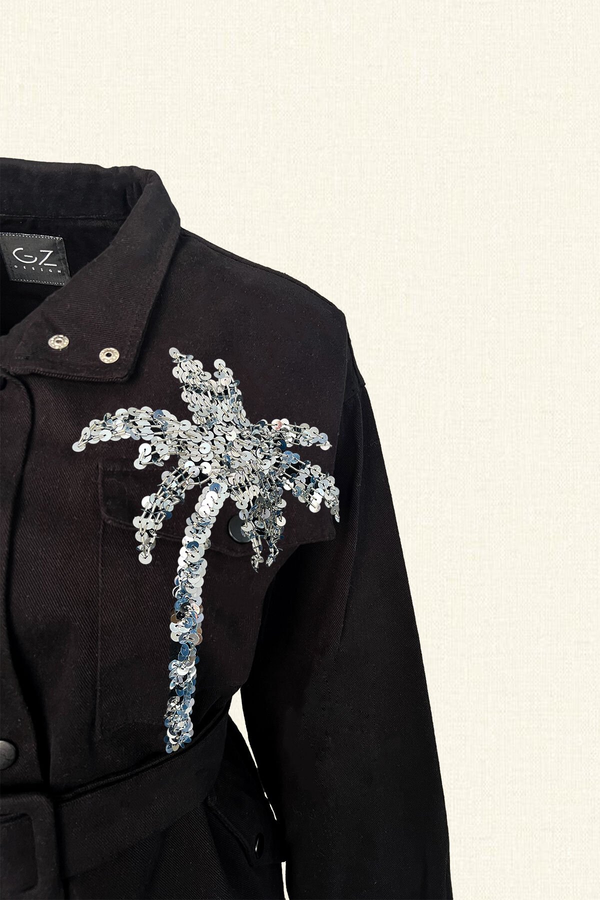 Ön kısmında pul ve boncuklardan işlenmiş palmiye bulunan,kemer detaylı siyah jean ceket.