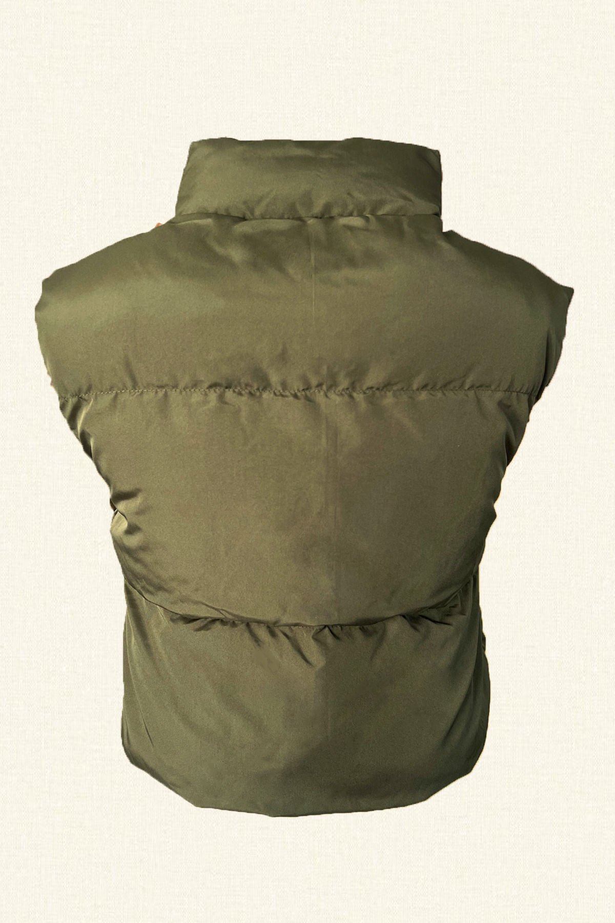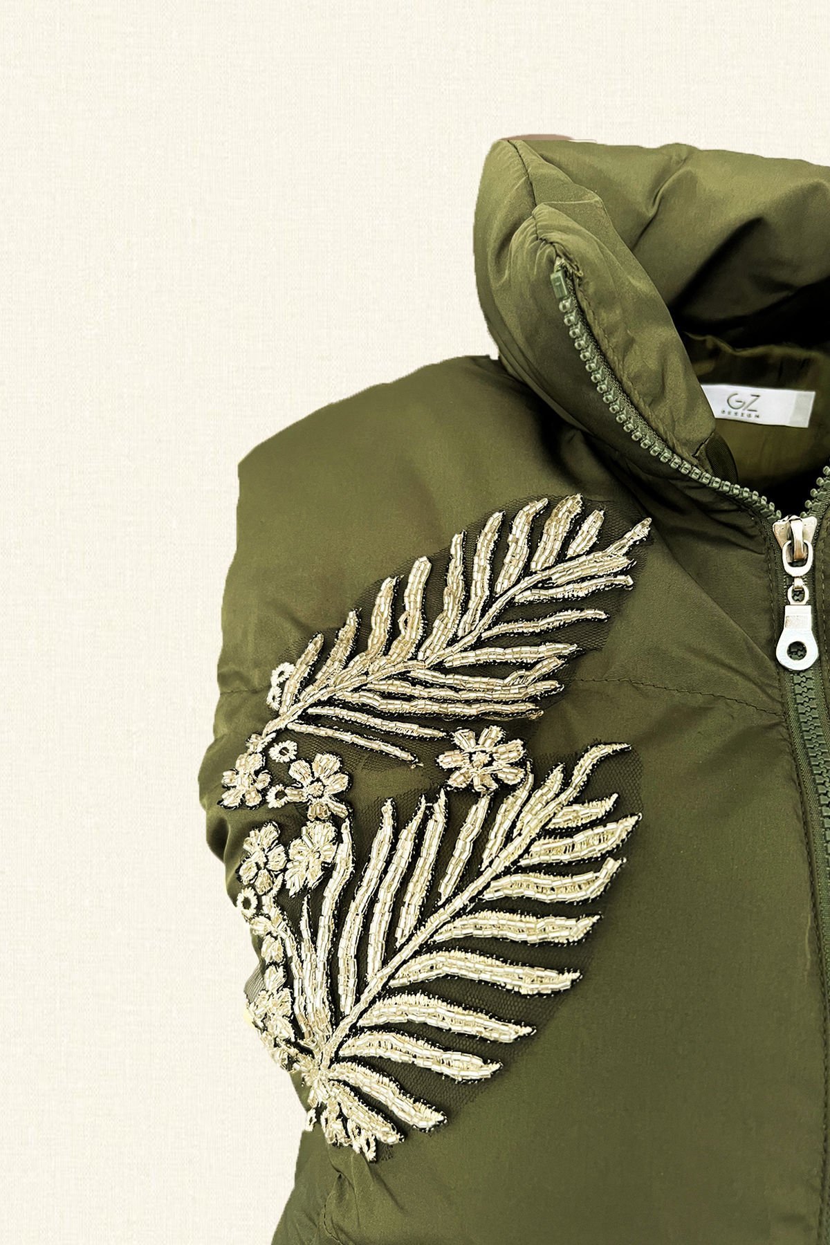 Ön kısmında gümüş boncuklardan yaprak işlemesi bulunan, bomber yeşil şişme yelek.