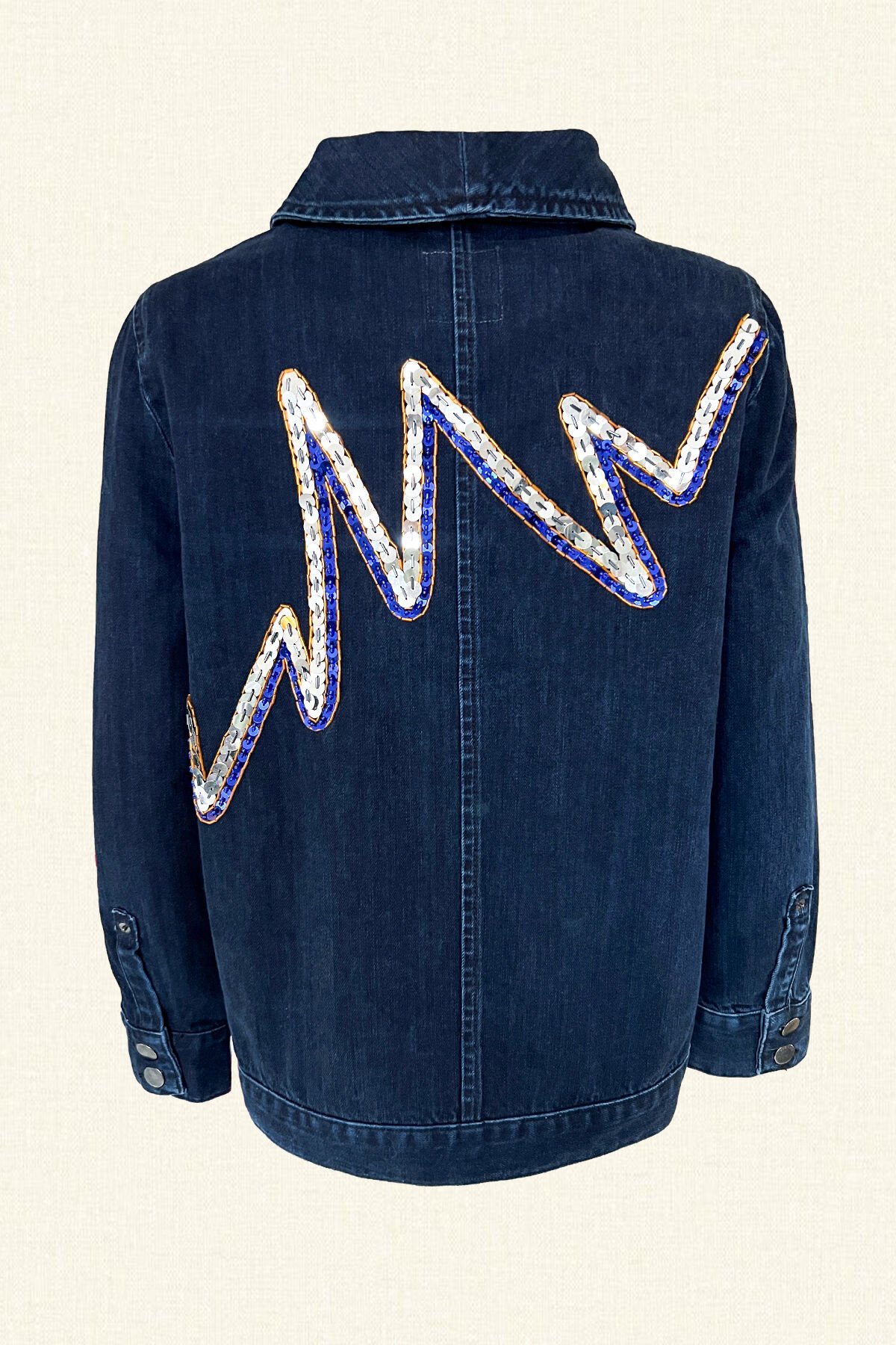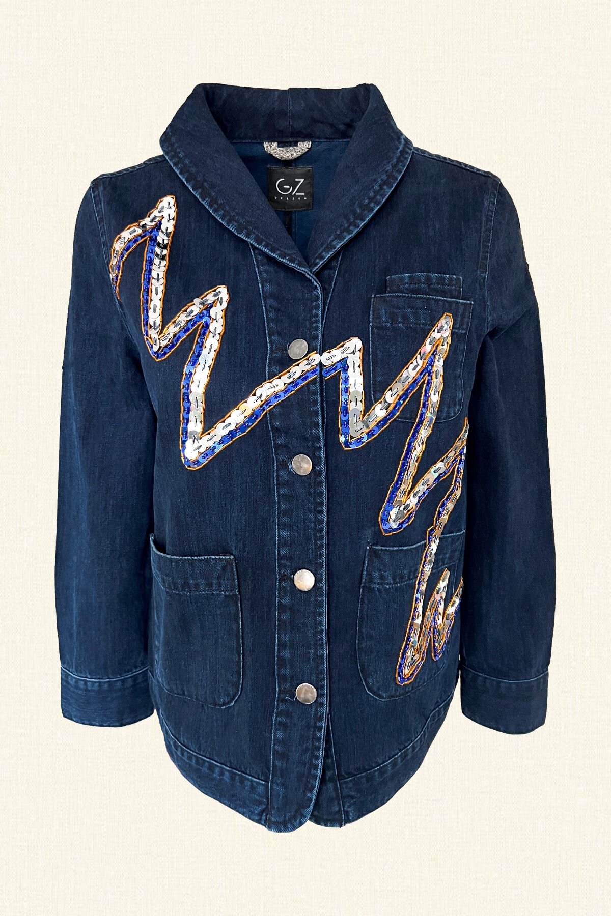 Ön kısımdan arka kısıma doğru gümüş, lacivert pul ve turuncu boncuklardan zikzak işlemesi bulunan, yuvarlak yaka, koyu renk jean ceket.