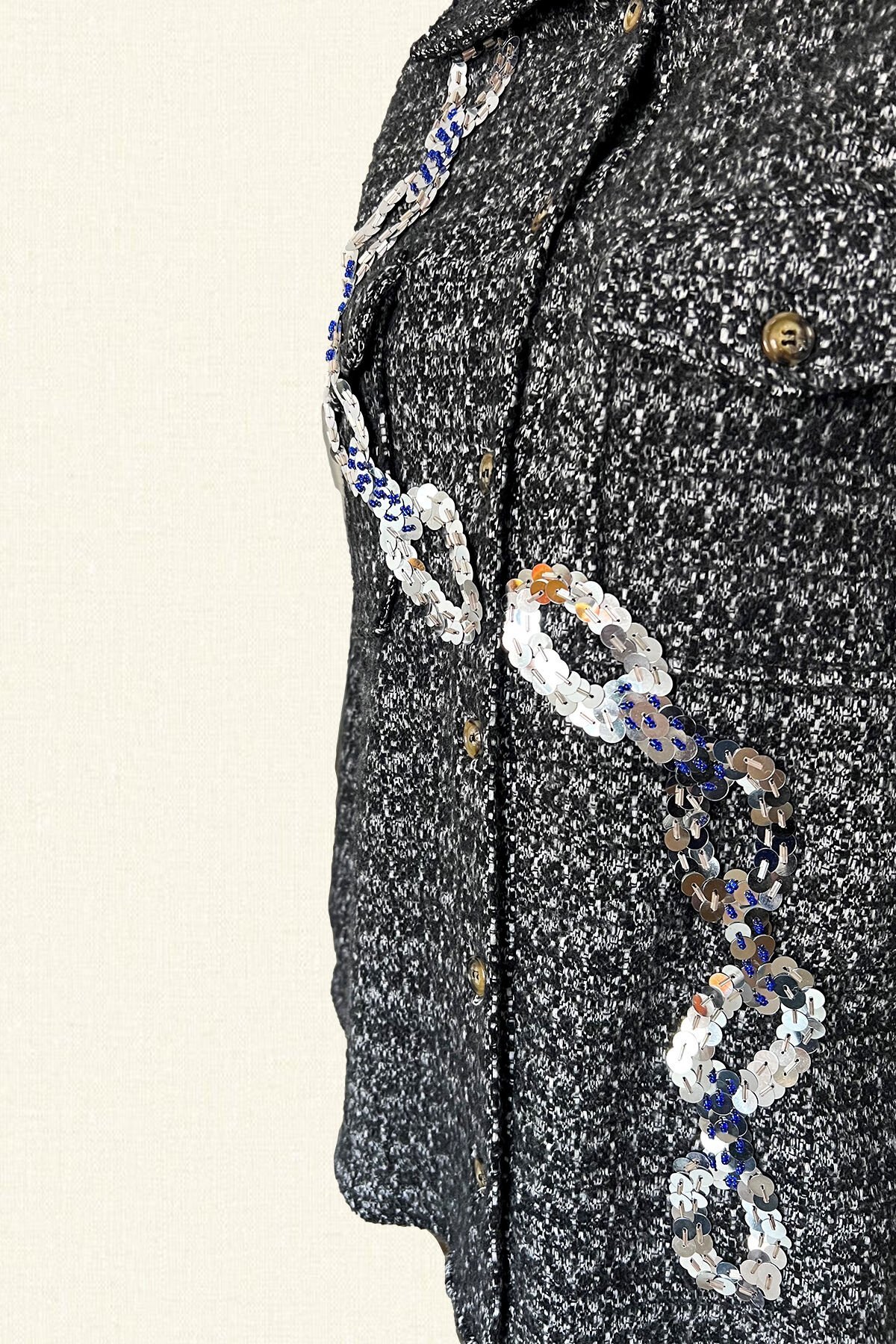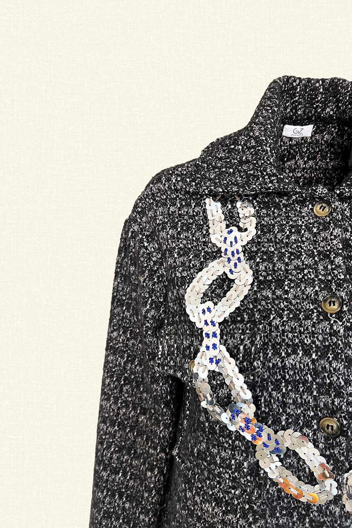 Ön kısmında gümüş pul ve mavi boncuklardan zincir işlemesi bulunan, siyah renk, düğmeli, oversize yün ceket.