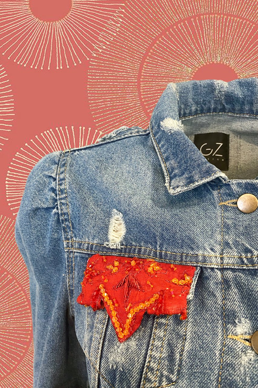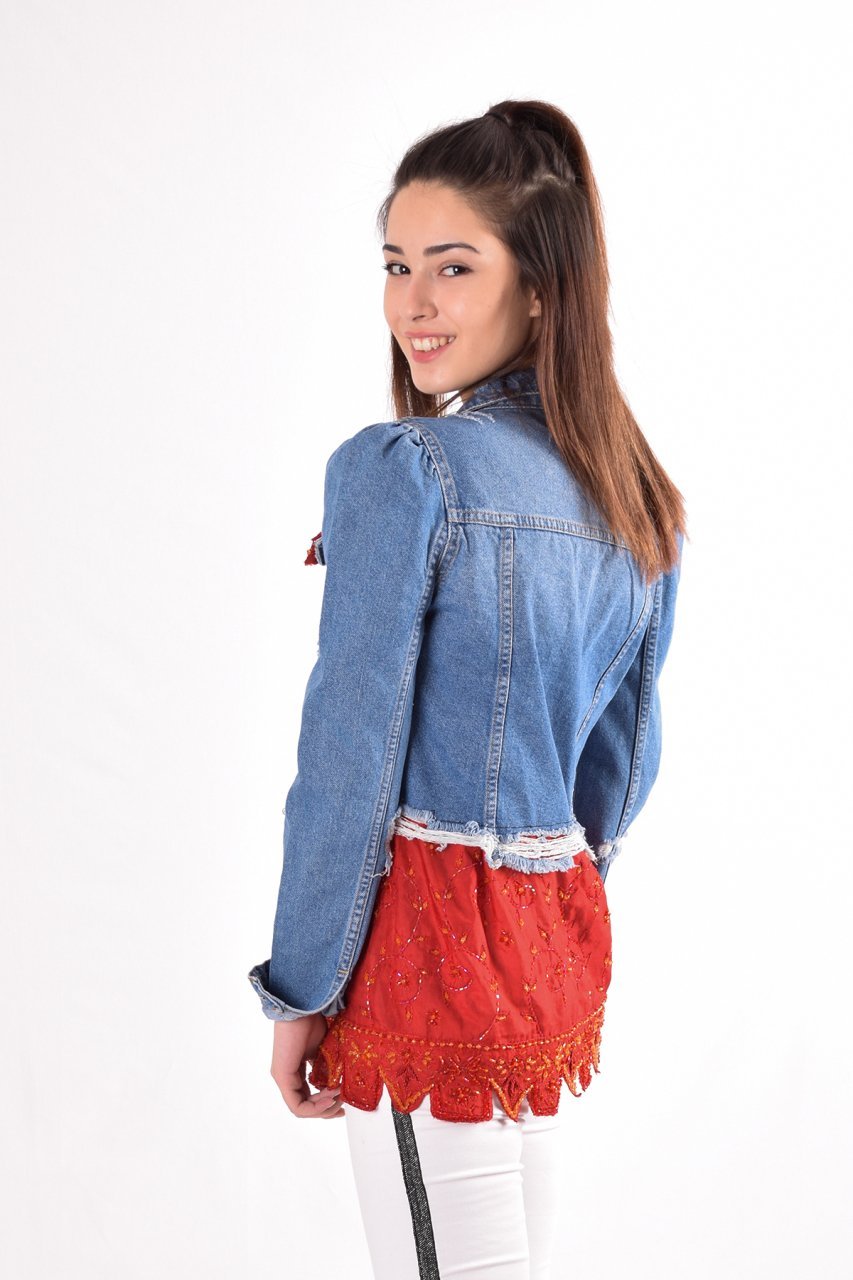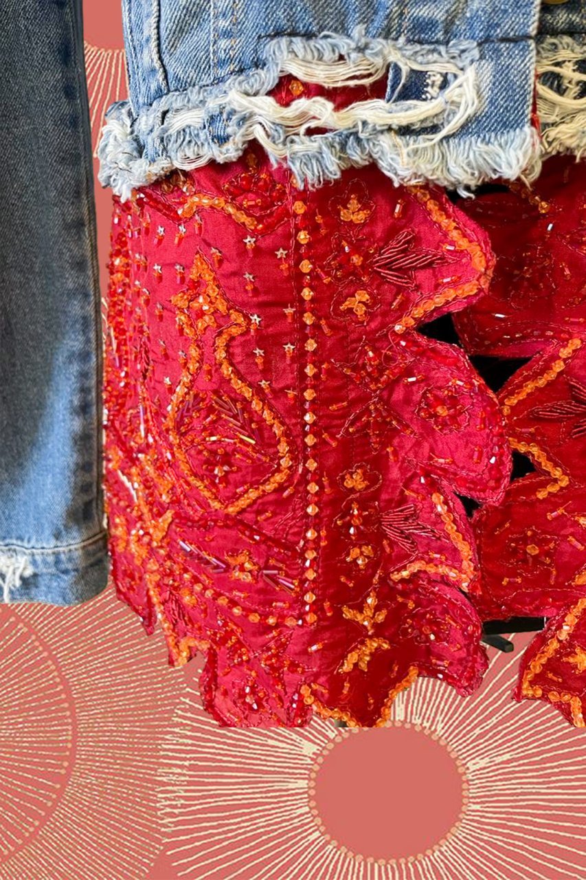 Etek ucu kırmızı Hint esintili balon kollu jean ceket.