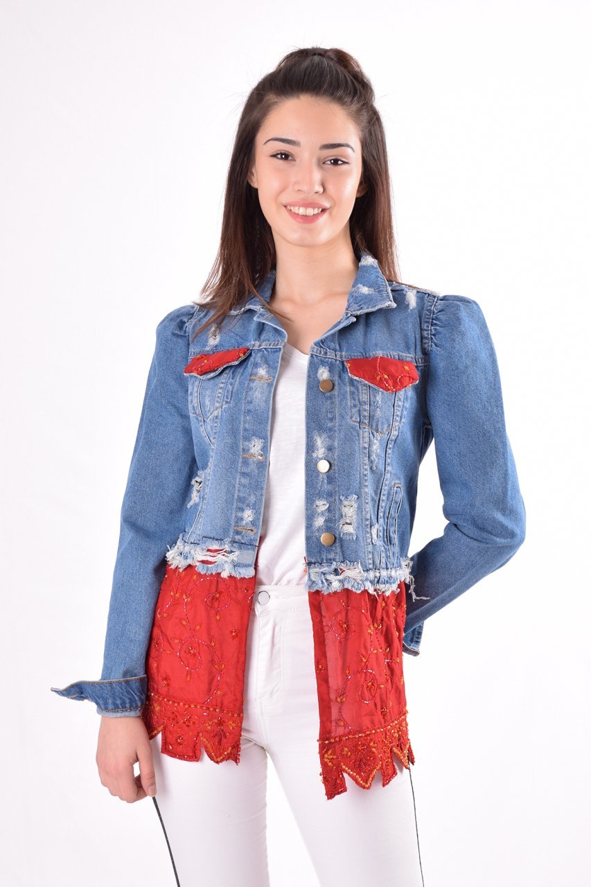 Hint Esintili Eteği Kırmızı Kumaşlı Jean Ceket