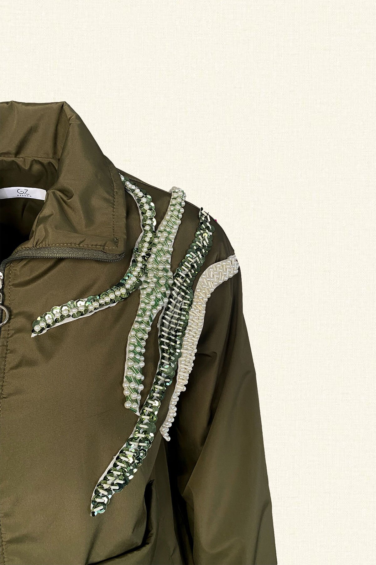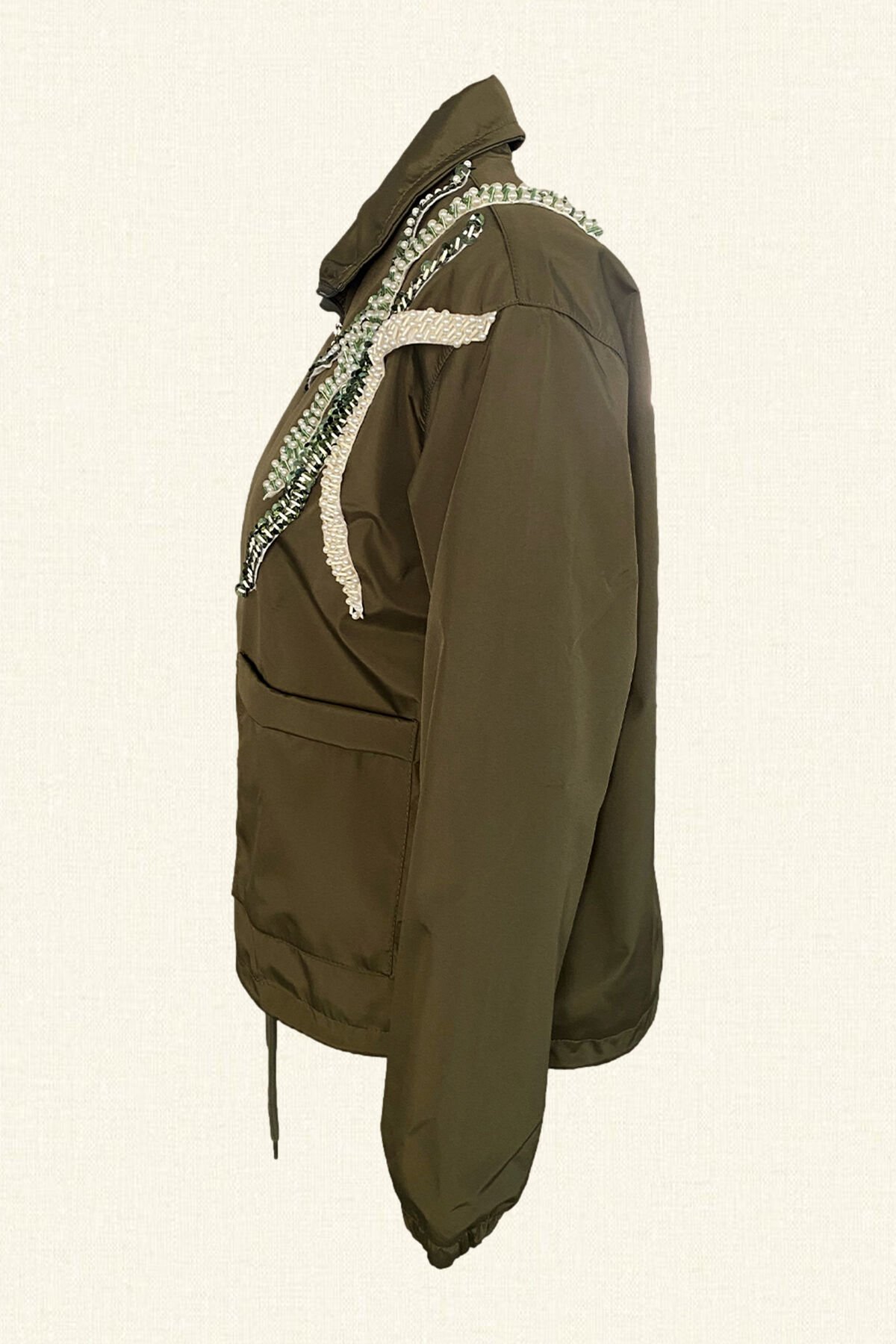 Yaka kısmında inci, kristal ve boncuk işleme bulunan, kolları lastik ve yağmurluk ucunda bağlama detayı bulunan haki yeşili astarlı yağmurluk.