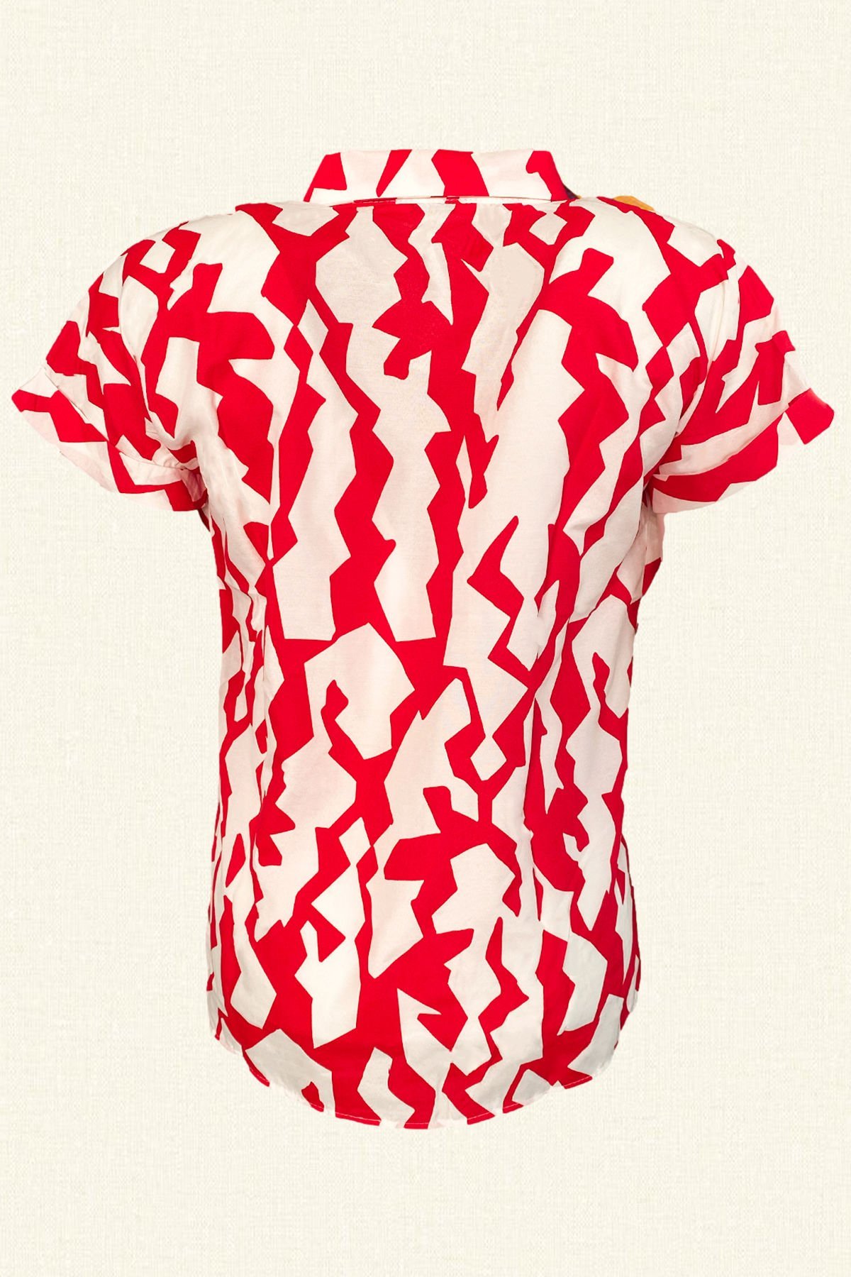 İşleme Detaylı Kırmızı Desenli Kısa Kollu Gömlek