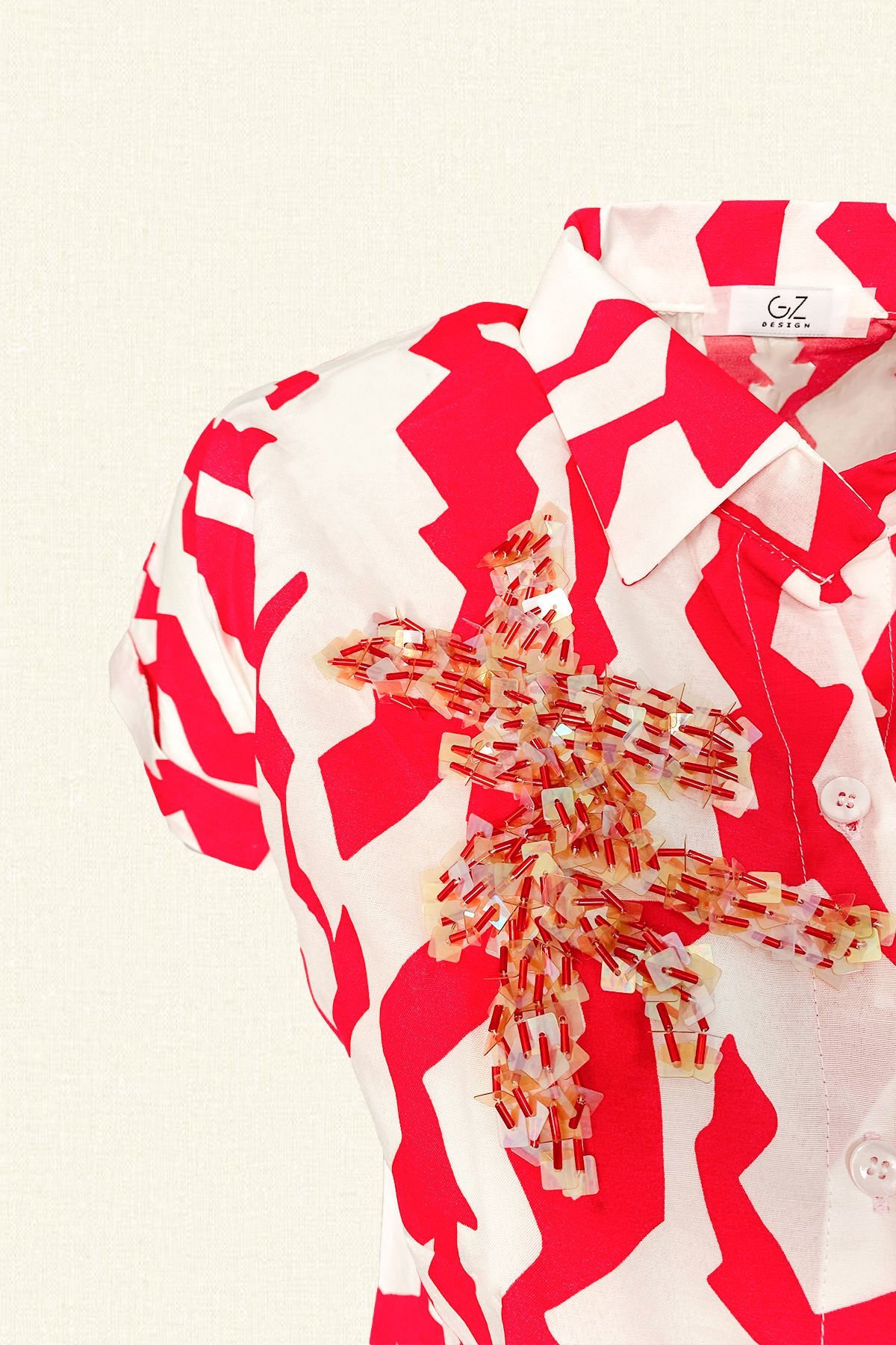 Gömleğin ön kısmında şeffaf pul ve kırmızı boncuklardan işlemesi bulunan, kendinden desenleri bulunan kısa kollu gömlek.
