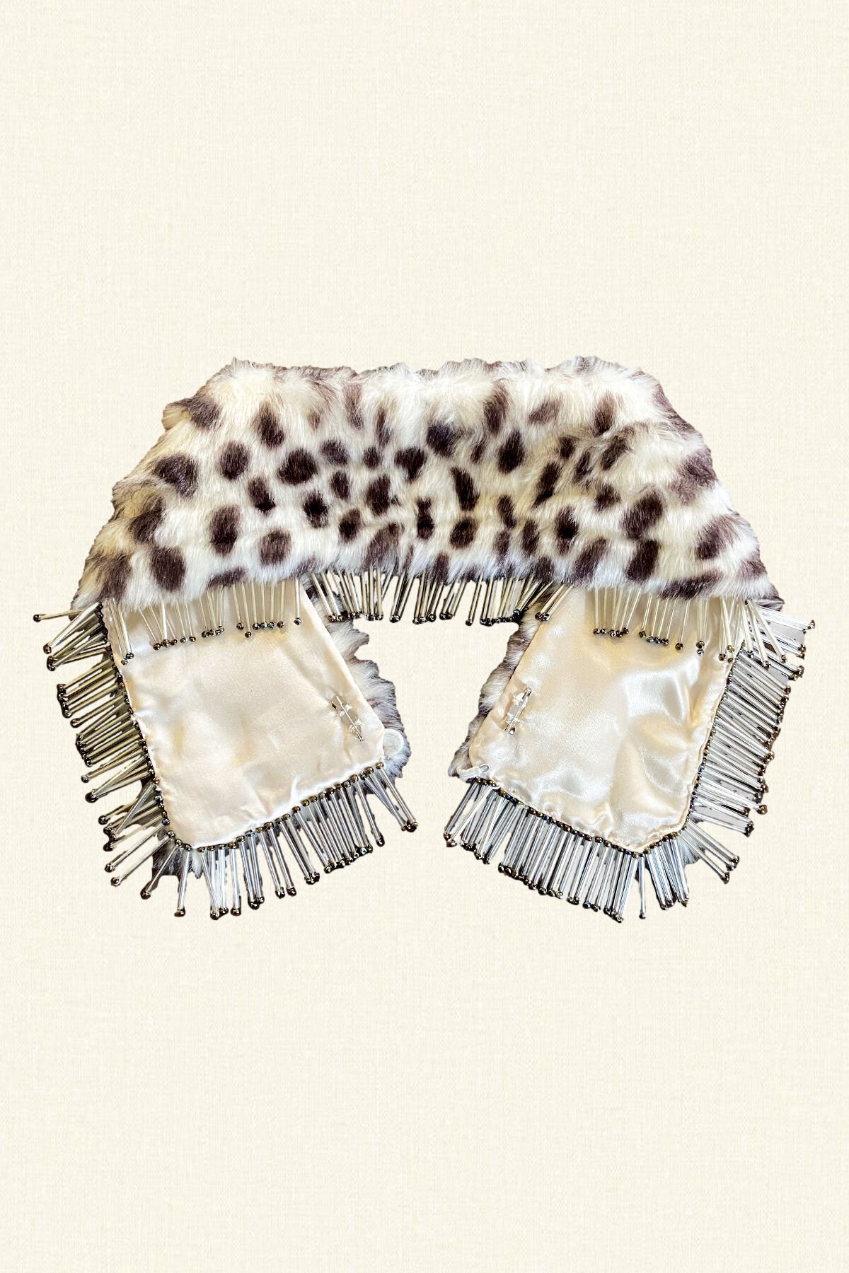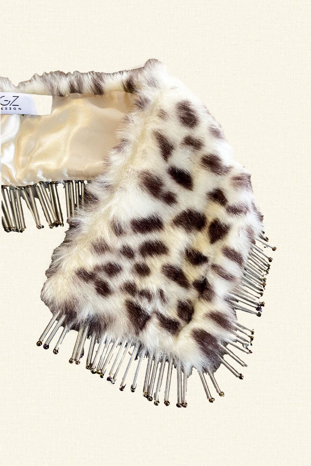 Şal Kahverengi benekleri olan, boncuklardan püskül detaylı kürk yakalık.