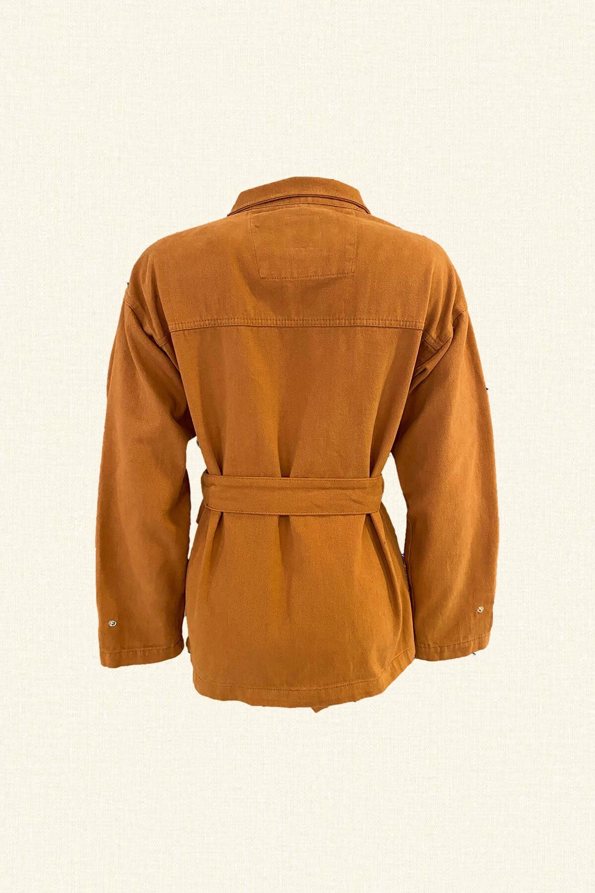 Omuz kısmında kahverengi deri üzerine kristal işleme, kemer detaylı kiremit renkli ceket.