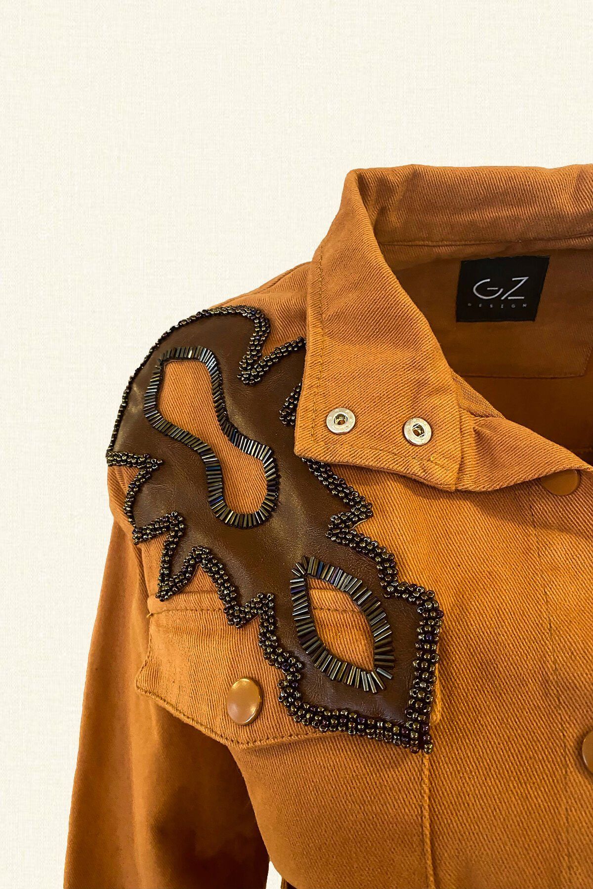 Kahverengi Deri Üzeri Boncuk Detaylı Kiremit Renk Jean Ceket