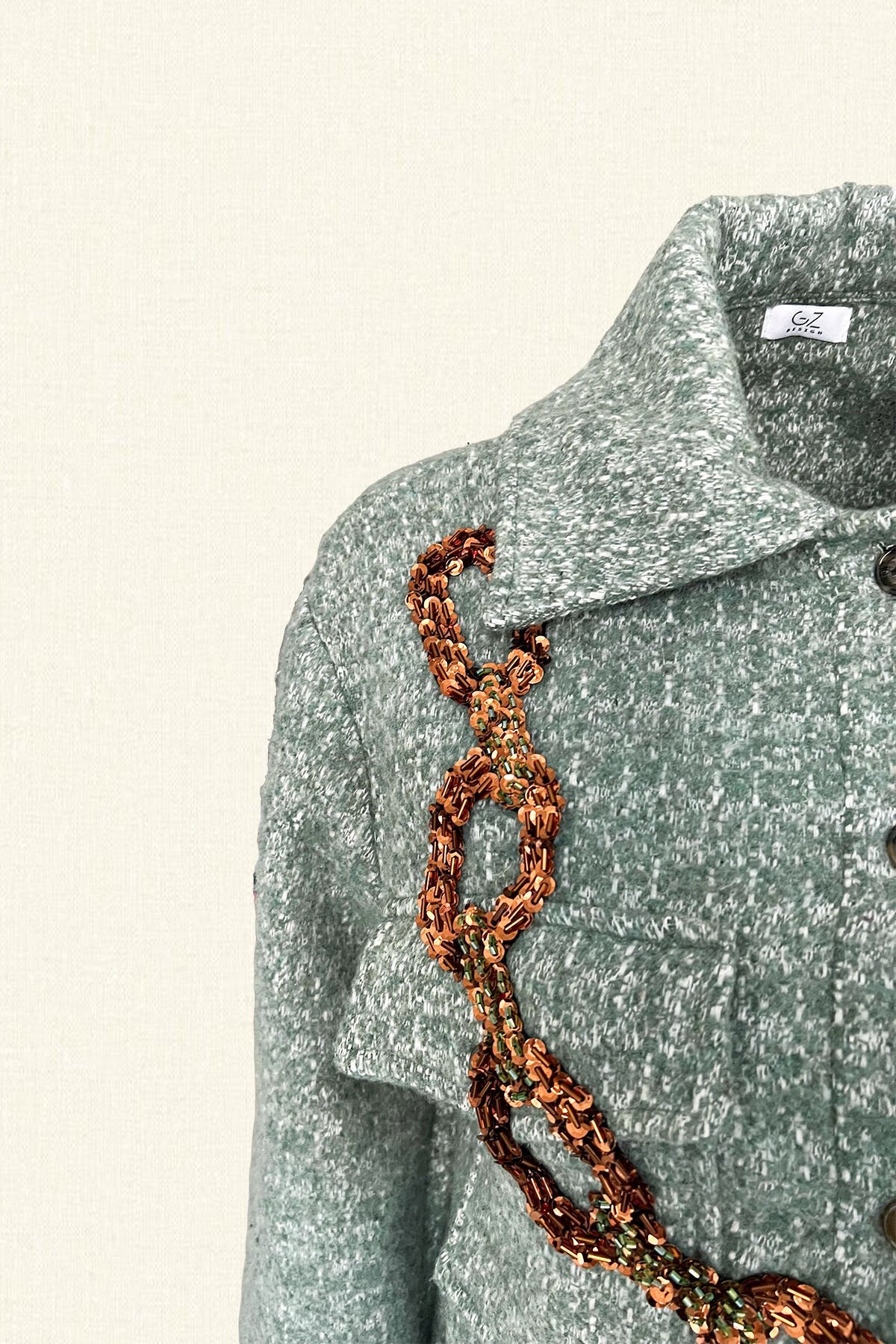 Kahverengi Zincir İşlemeli Mint Yeşili Yünlü Kaşe Ceket
