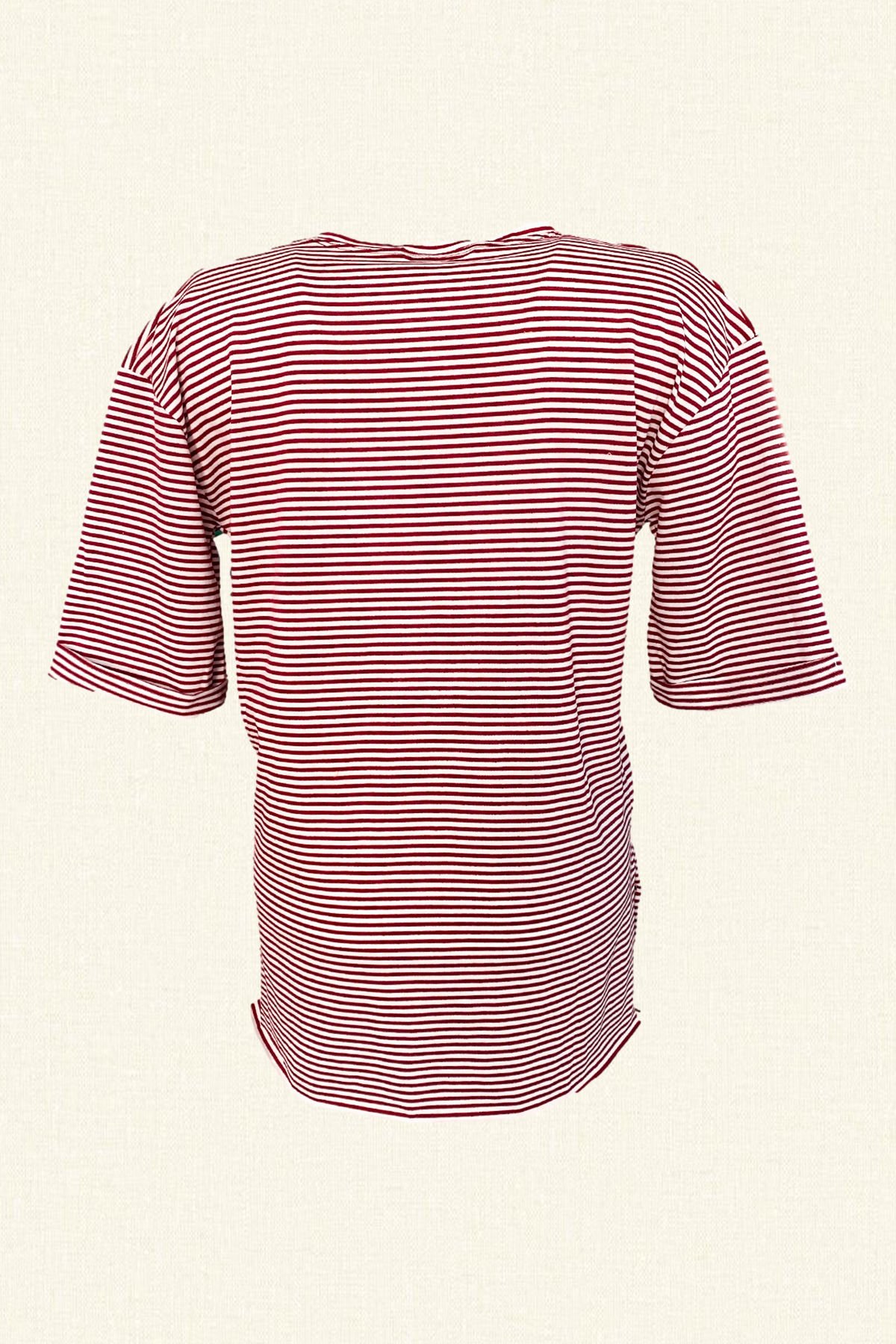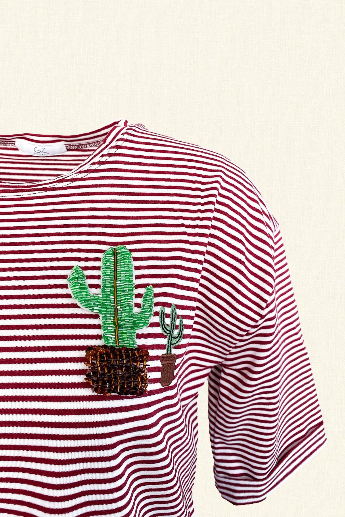Ön kısmında boncuklardan kaktüs işlemesi bulunan, yanlarında yırtmaç detaylı bordo çizgili oversize tişört.